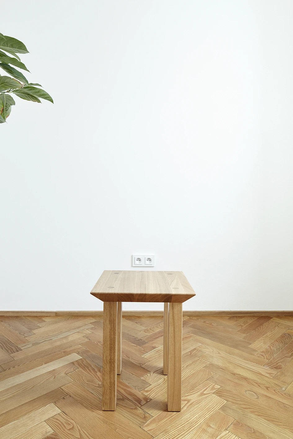 Facing the street, there is a lavish lounge room – a “parlour” – with a kitchen. The owner, a doctor, owns a large collection of books so his wish was to have a large enough bookcase to accommodate his entire library. It takes the whole length of a six metres long wall. There are three other rooms-bedrooms looking into the centre of the block. The interior’s dominant element is the wooden floor. The fitted furniture made from a MDF board creates a neutral white background. The environment’s diversity of colours is provided by canvases, books, flowers and people. The dining table, conference table, bed and the bedside tables are made of oak wood and are designed specifically for this apartment. Washable surfaces of the kitchen, washroom and restroom are made from grey polished cement screed.