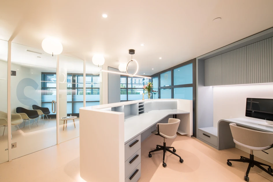 Within two weeks and with a precise budget, a new architectural concept was realized to be able to welcome the patients again as quickly as possible. This included new wall and floor coverings, a modern lighting concept, the reception area as well as all practice fixtures, furniture, signage as well as visual and sun protection.New easy-to-clean surfaces and a holistic architectural concept optimize the practice‘s internal processes.