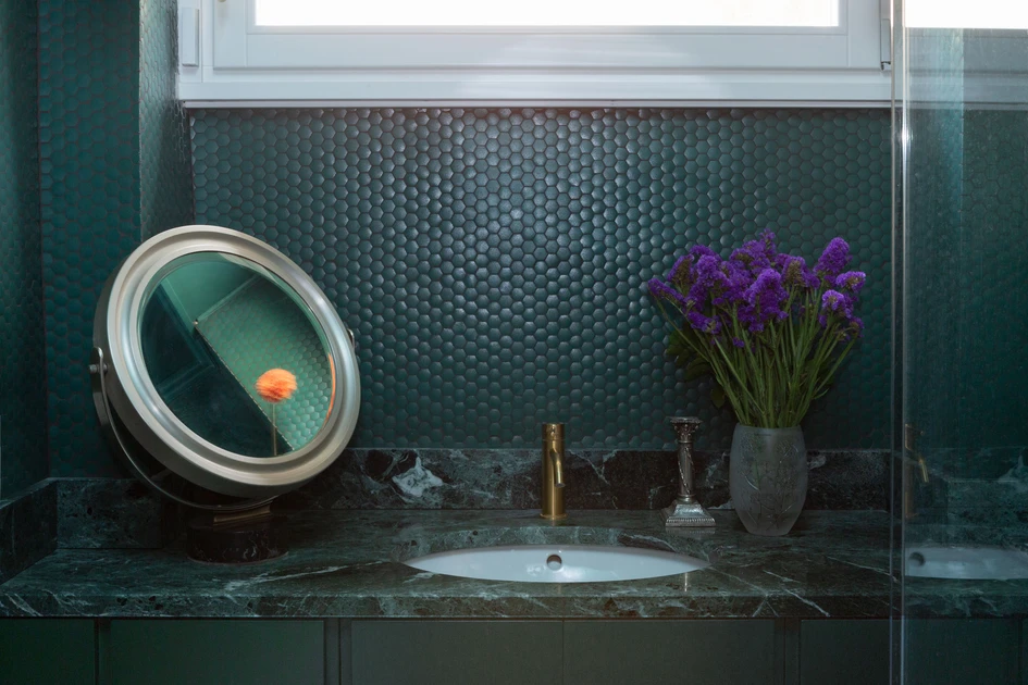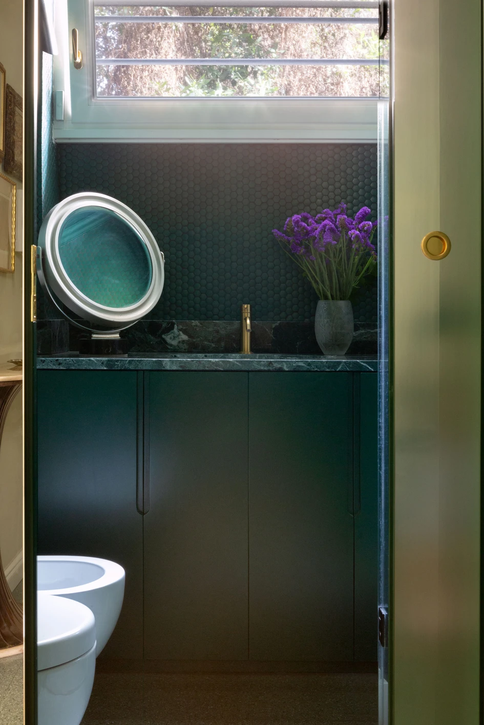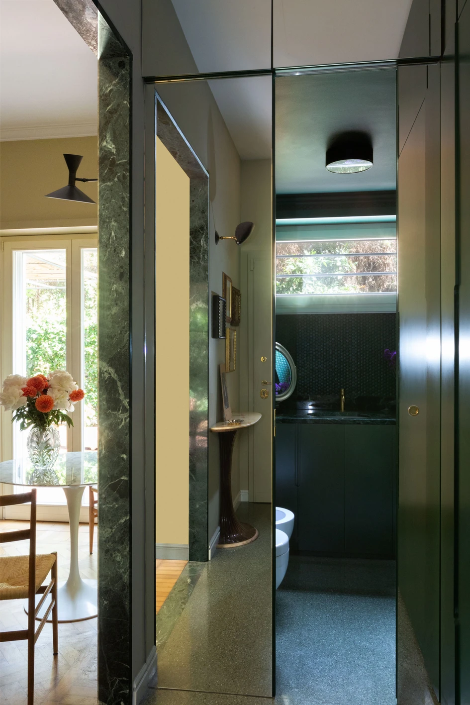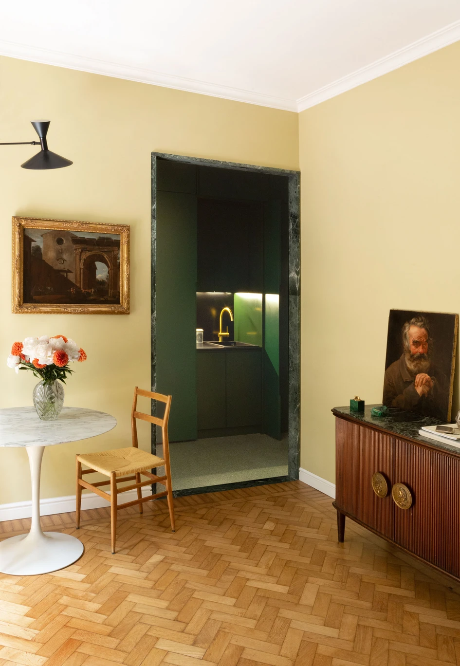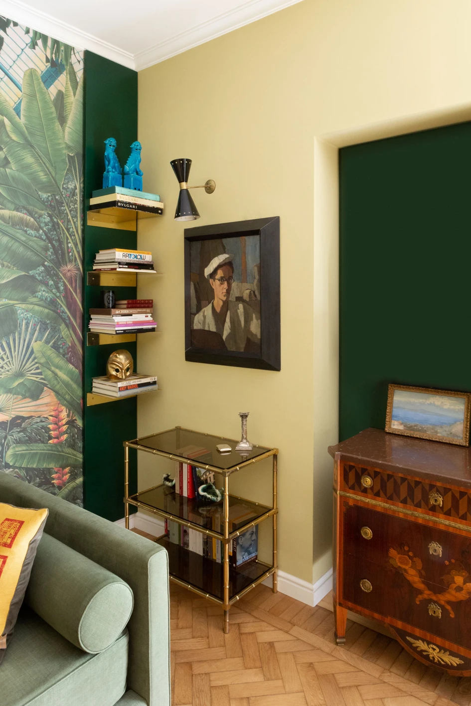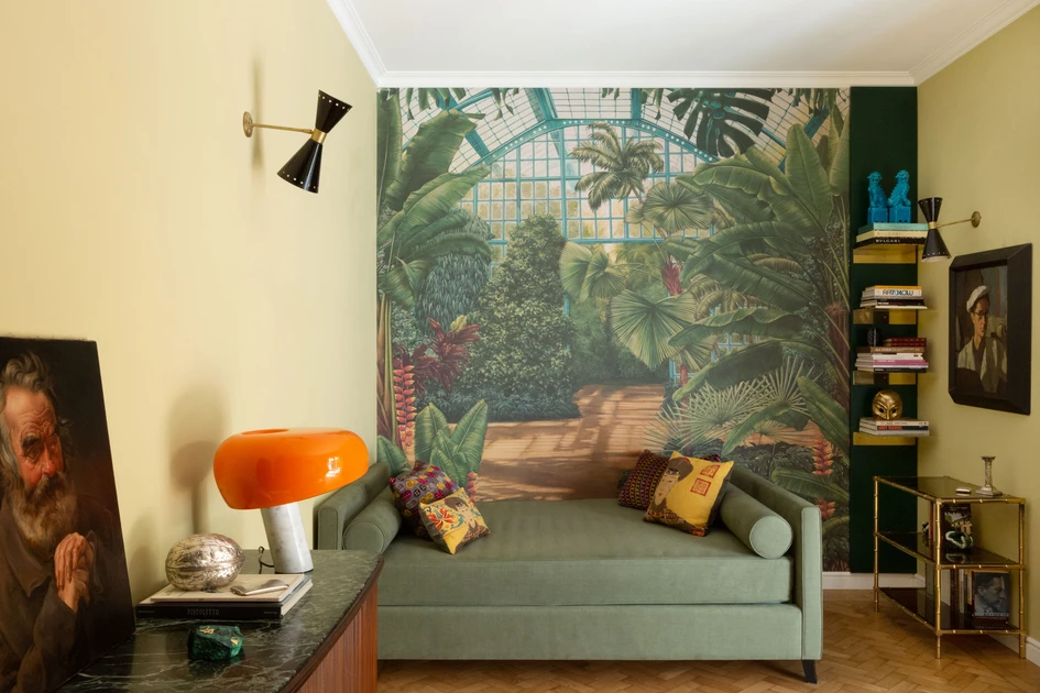 To amplify this sensation - and the space - a wallpaper of a luxuriant garden with greenhouse becomes the backdrop of the living room. All embellished with brass elements and the furnishings and paintings of the young collector.