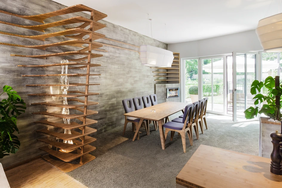 Insgesamt 190 Objekte wie Stühle, Schränke und Leuchten wurden exklusiv für dieses Projekt entwickelt und produziert. Um den ökologischen Fußabdruck dabei so klein wie möglich zu halten, kam vor allem emissionsfrei verklebter Bambus als Grundmaterial für die Möblierung und des Fußbodens zum Einsatz.