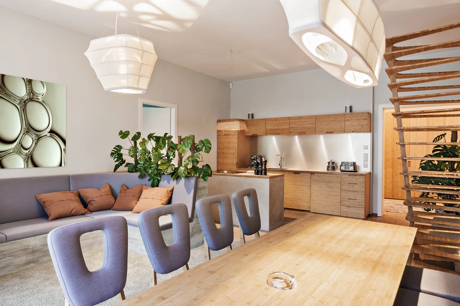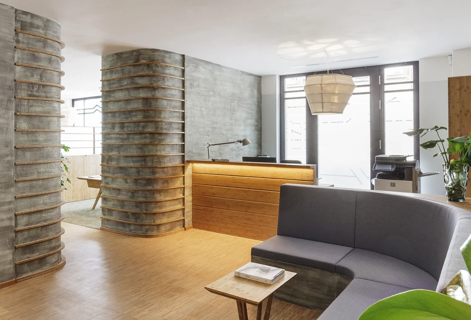 Durch die Synergie von Natur und Design nutzen die Architekten die Bürofläche optimal. Eigens entwickelte Leuchten aus Akustikfilz reduzieren nicht nur Lärm, sondern zeichnen entspannende Lichtszenarien über die Arbeitsplätze. Schilfgrüne, hochflorigen Teppiche sorgen für Behaglichkeit und unterstützen eine ruhige Atmosphäre. Die verwendeten Lehmfarben und mineralischen Kalkputze erzielen zudem eine weiche Beton- und Valsersteinoptik an Wänden und Oberflächen. Vor allem aber der durchdachte Einsatz unterschiedlicher Pflanzen und Moosskulpturen sorgt für weit mehr als nur wohlwirkende Akzente: auf breiter Fläche regulieren die Gewächse die Luftfeuchtigkeit, erhöhen den Sauerstoffgehalt und geben so der Kreativität neue Kraft.