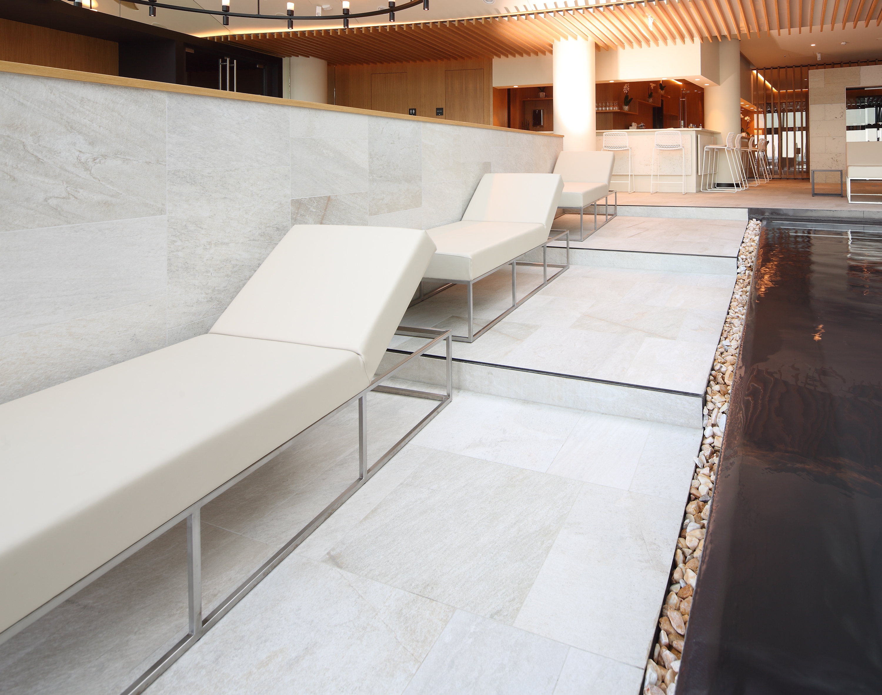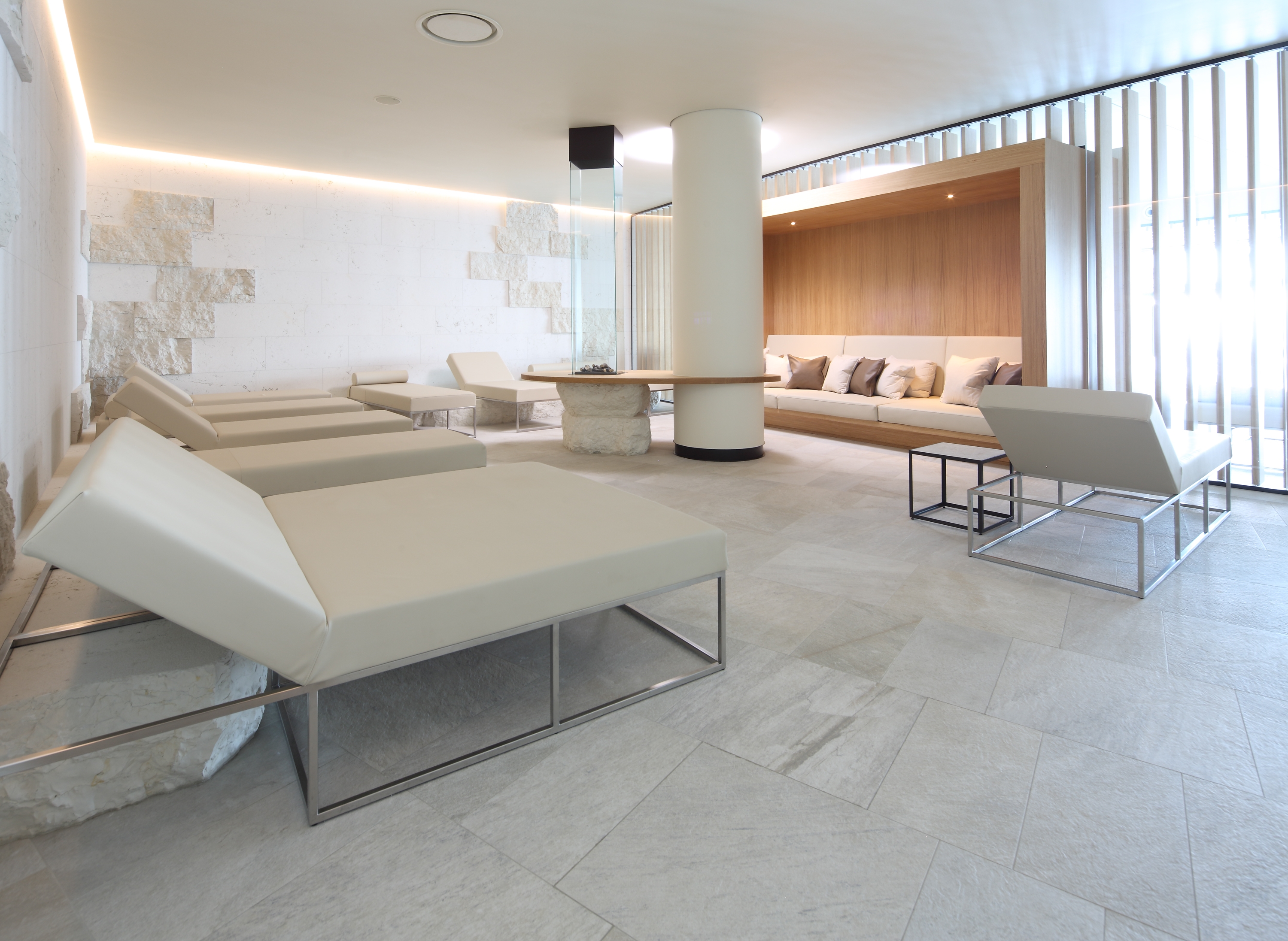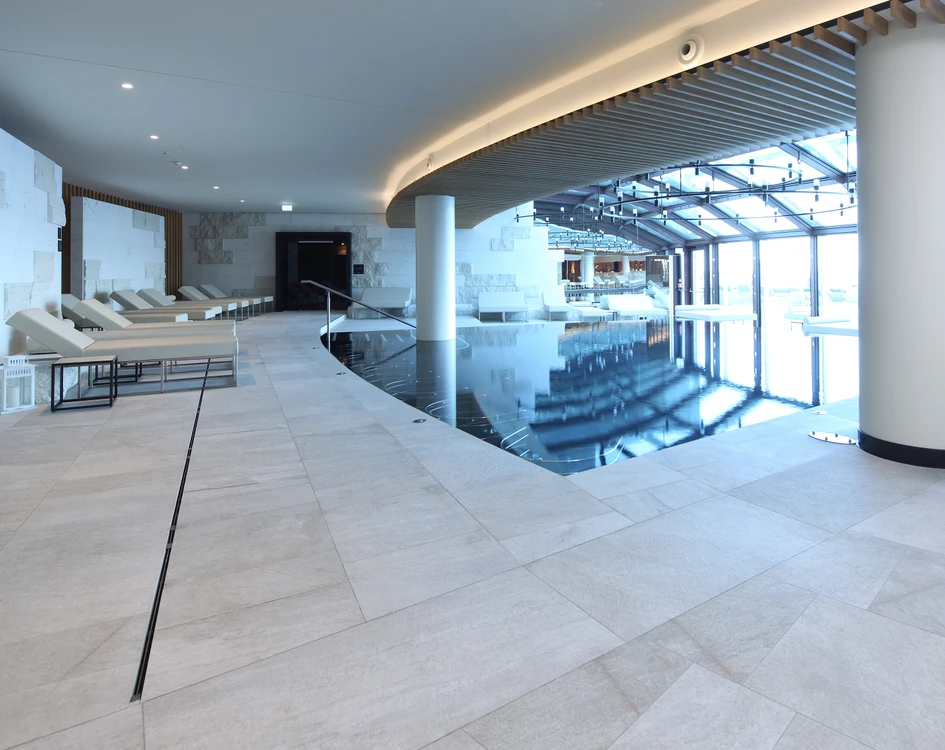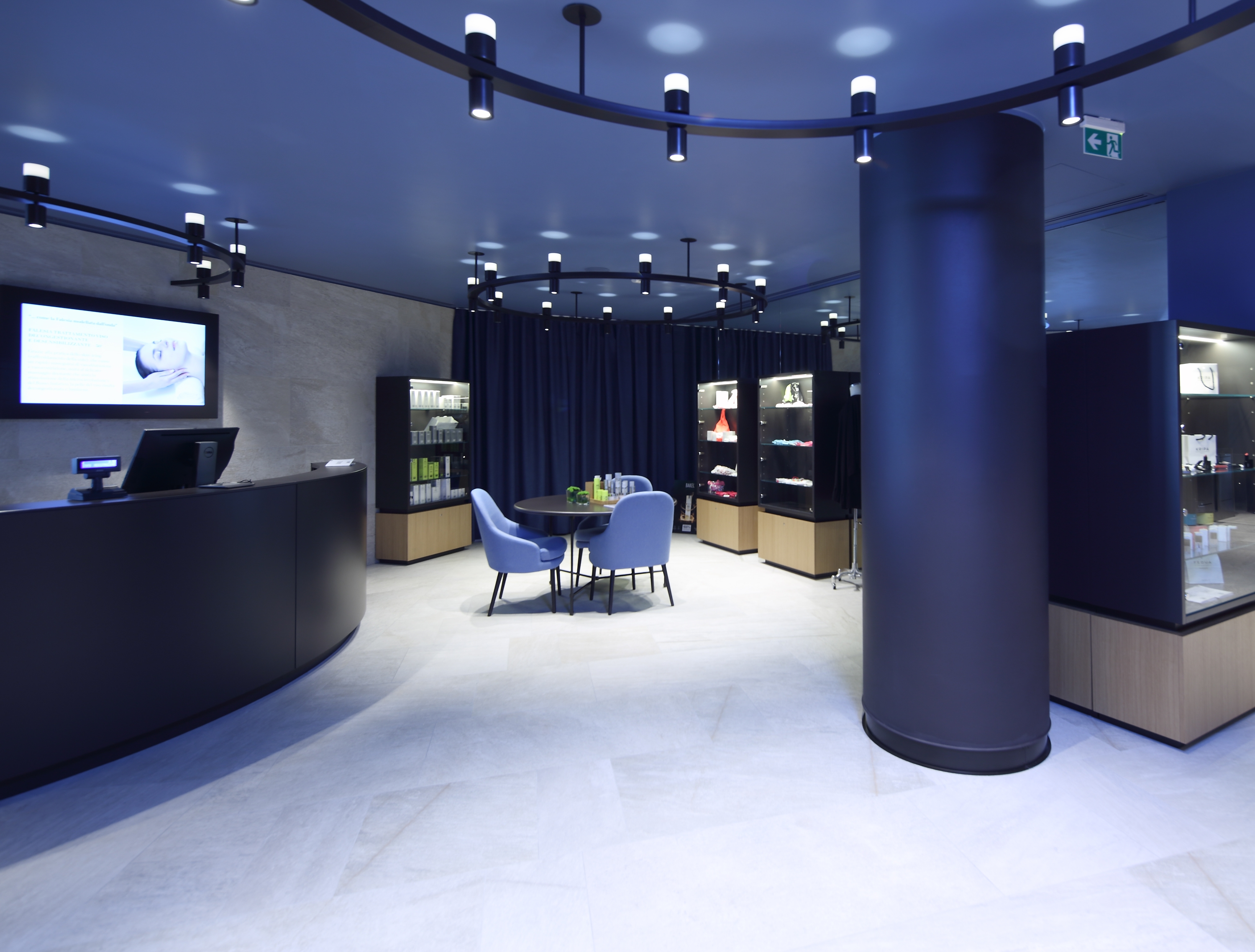 The focus on wellness permeates the whole structure, starting from a more collective and choral dimension, on the ground floor, and closing increasingly to intimacy and privacy as you ascend to the floors above. The entrance features an imposing covered porch, which welcomes customers and leads them inside. The building is fully glazed, providing perfect inter-connection between interior and exterior. The design had to pursue the efficiency and reliability of the solutions chosen, with particular attention to rationalising traditional energy sources and their ease of management and maintenance. It was therefore decided, wherever possible, to equip the complex with solutions which pay particular attention to reducing energy consumption by using renewable sources.