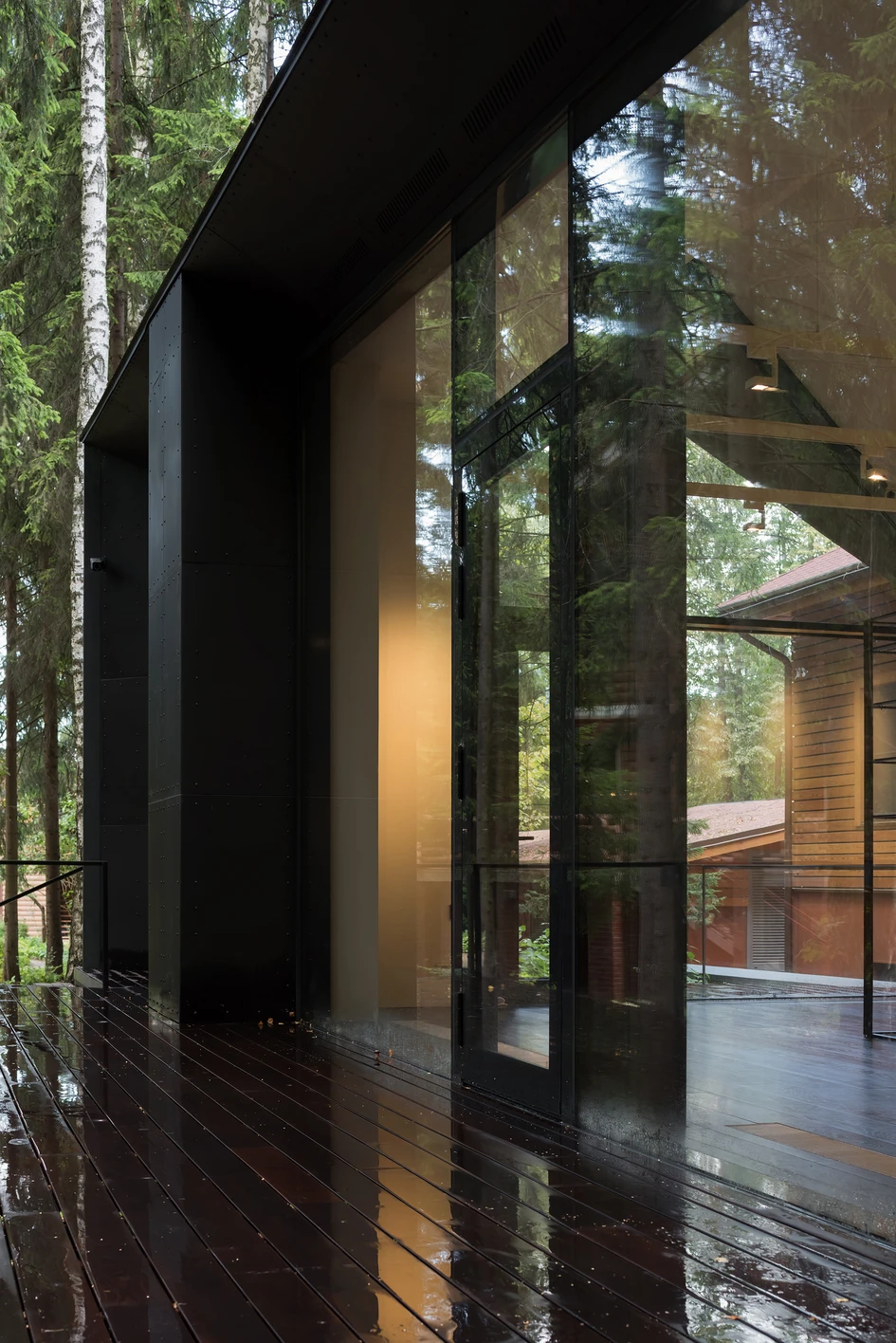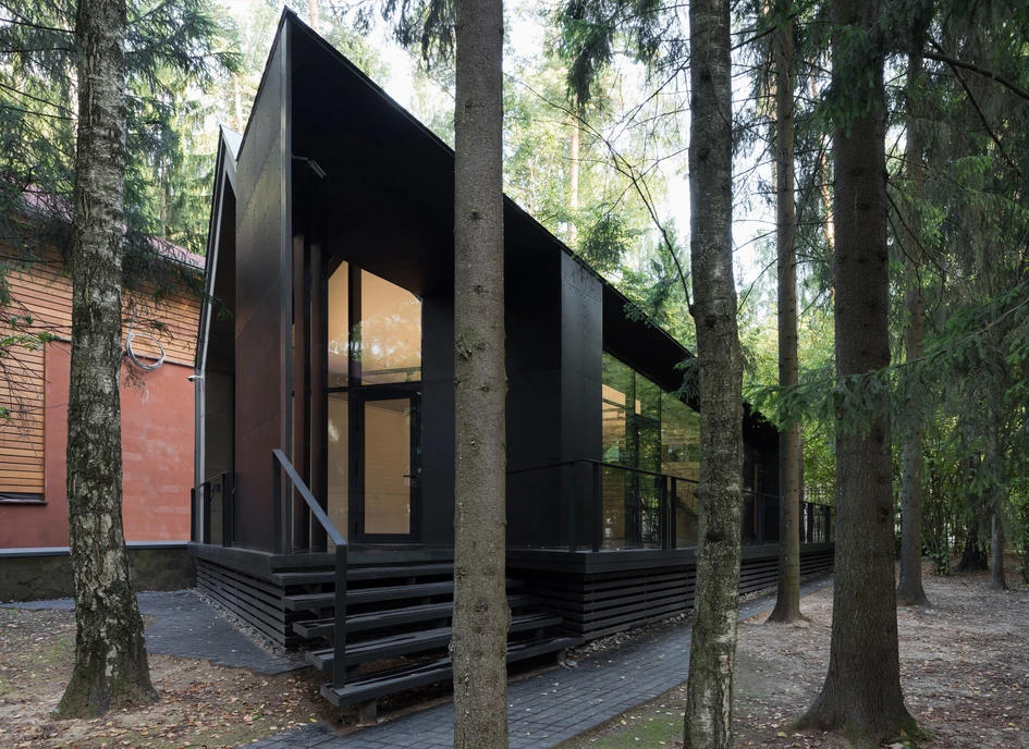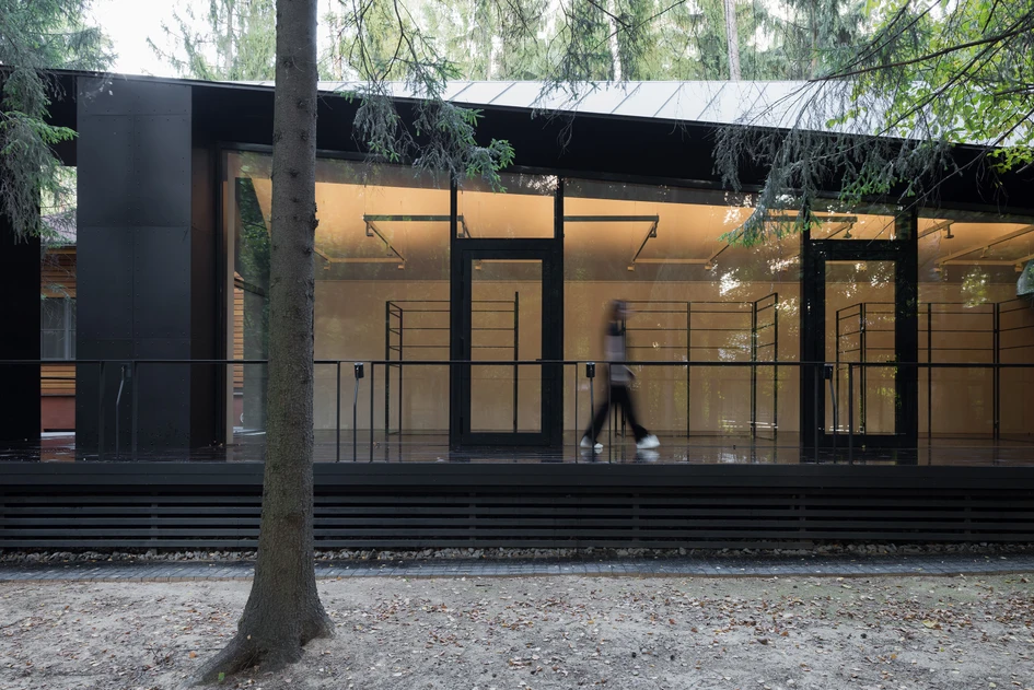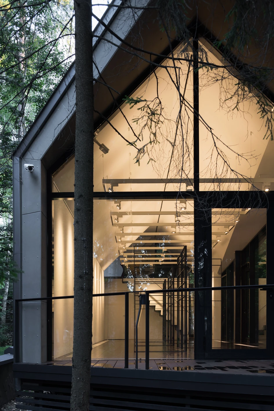Private art gallery for a personal collection of works of the 20th century is a traditionally shaped house with a gable roof and undercuts of facades. One wall of the building represents some kind of showcase due to panoramic windows through which the exposition space is visible.