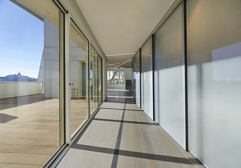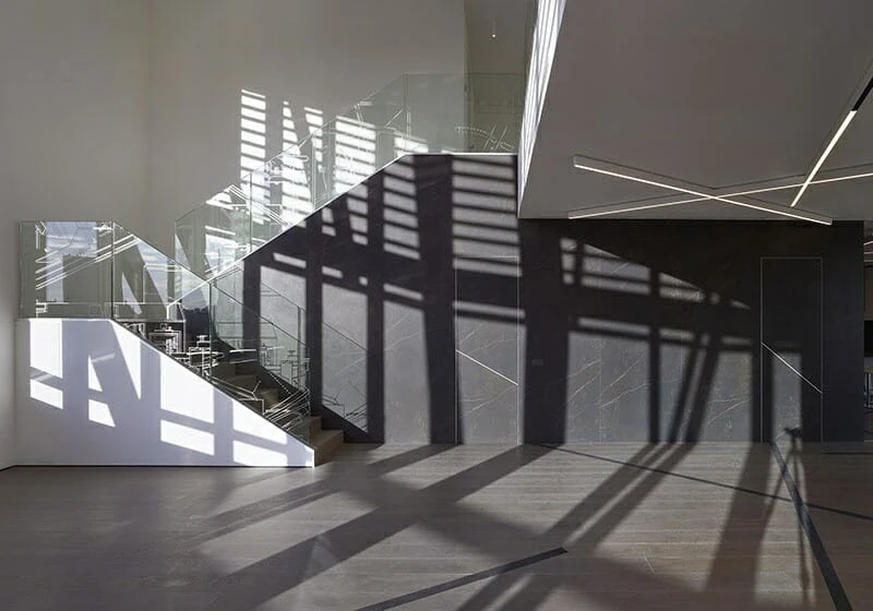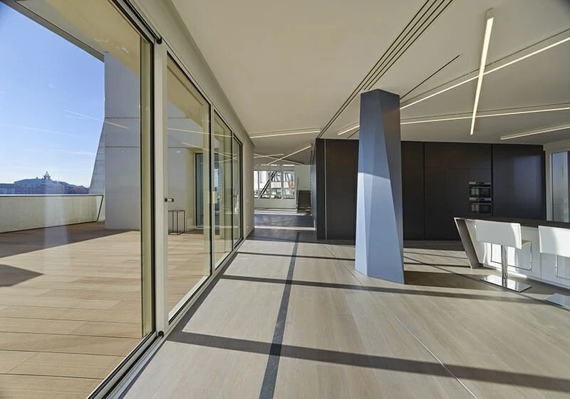 Studienprojekt Libeskind New York und SBGA, 2017. City Life - Libeskind Residenzen. Umsetzung: matt lackiertes Wall&Door-System mit Schwenktüren und Fräsgriffen; Schiebesystem Shoin mit 4 Schiebetüren mit schwarz eloxiertem Profil und extra klarem satiniertem Glas; matt lackierte Rasomuro_55s Türen; mit Dekton beschichtete Rasoline_55s Türen ohne Griff mit integriertem Türschließer und elektrischem Türöffner zum Öffnen mit Badge.