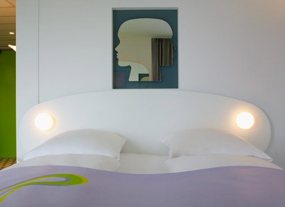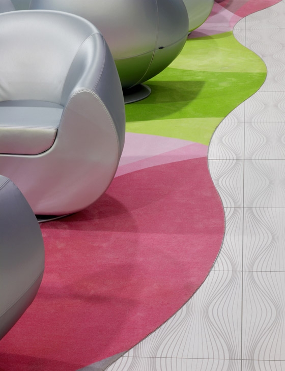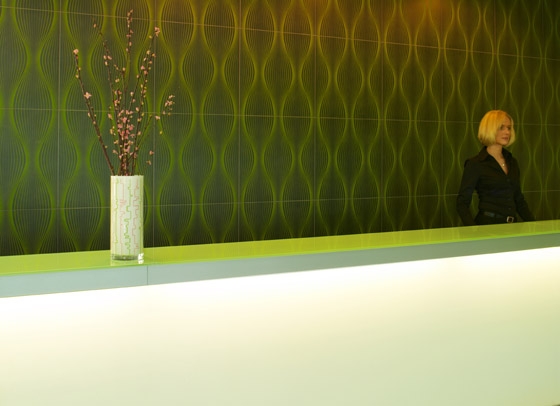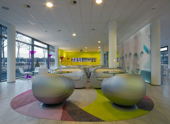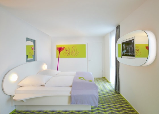 The necessity of the client is actually the necessity of the hotel guest. Besides the physical interior landscape, Karim designed an experience. Karim Rashid Inc designed or selected the music, the shampoo and soap, the smell of the cleaning products, the logo, the staff uniforms, the hotel’s website, and a TV system that allows customer to check out from their room, chose their movies, and preview local information about the city of Bremen.