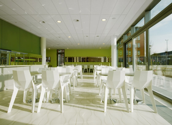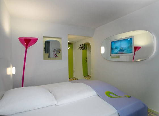 The budget hotel’s rooms are priced at only 59 Euro a night. The design maximizes choices and use of high performance materials and furnishings to have the greatest impact for the least amount of investment. The lobby area encompasses a bar, internet station, buffet and outdoor terrace. The guest’s journey continues upstairs, where tactile wallpaper coats the hallway. Room numbers are woven into the custom carpets in the hallways. The rooms were designed with a bargain budget of 3200 Euro per room for furniture, finishes and equipment. Prizeotel provides all the needs and details of a high-end boutique hotel and still creates a unique experience for the travelers. Amenities such as the iPod player/lamp and flat screen TV make the room worth far more than its 59 Euro price tag. High design is affordable to all.”