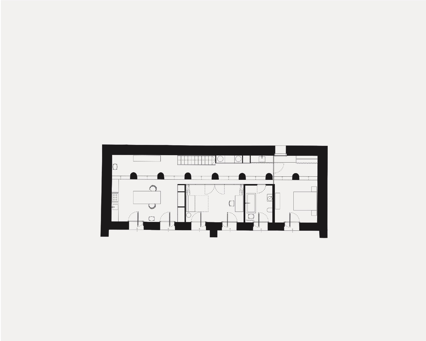 The two bedrooms, bathroom and kitchen are located on the ground floor in a cellular arrangement which makes use of a series of arched doorways. The open expanse of the upper floor is a generous light-filled space for relaxing, and the main social space of the house. Floating boxes clad in English sycamore create discrete spaces for a study and shower room that bookend the main space.