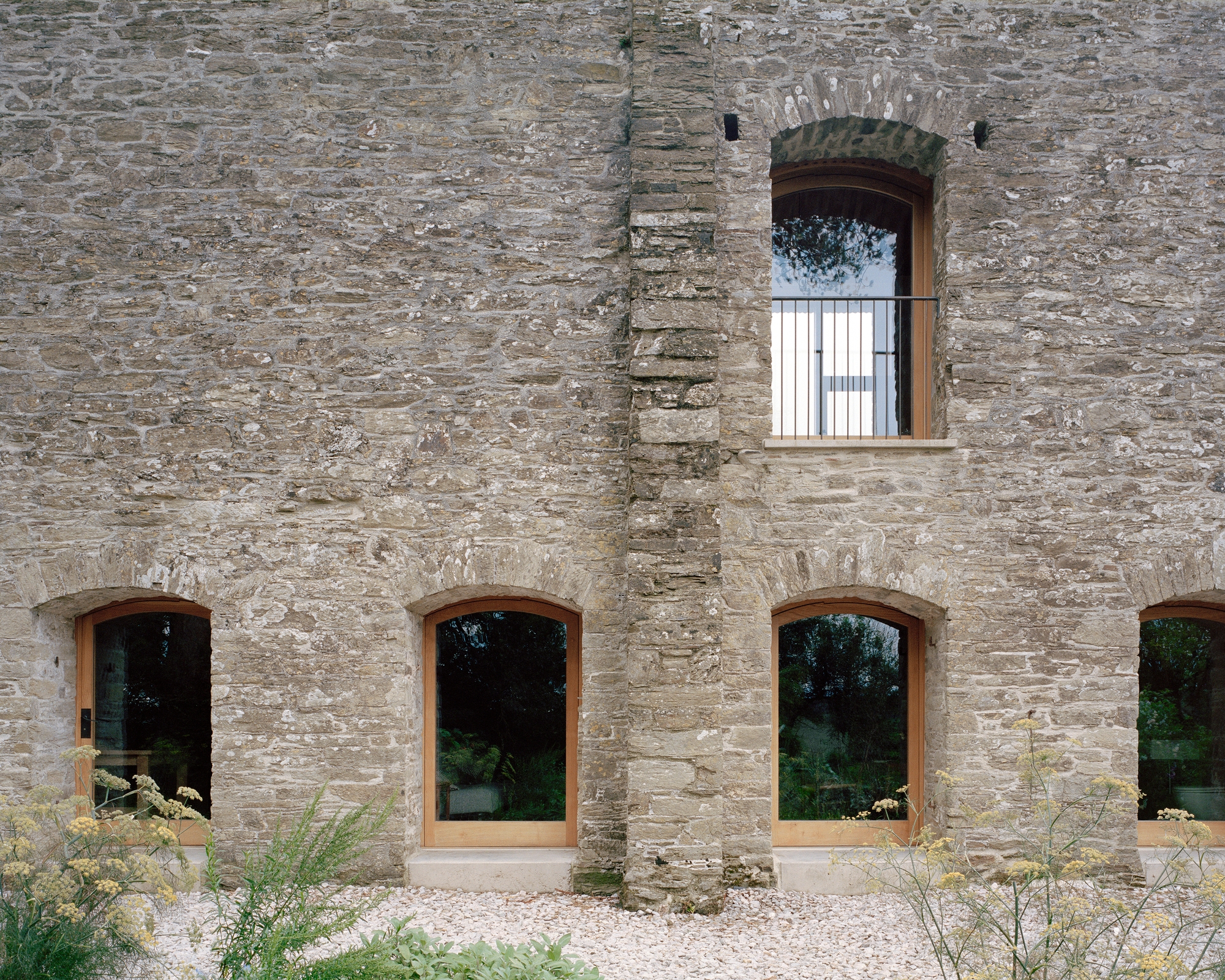 Intent on preserving the character of the original building with its monumental stone walls, TYPE’s strategy has been to create a new home within the reconstructed barn, rather than convert the barn into a house. The design utilises the original envelope, with no new openings imposed on the elevations. Fenestration is set back and minimal, allowing maximum light to enter. Pivot doors allow the wide openings that were originally made for cattle to remain undivided, yet easily handled.