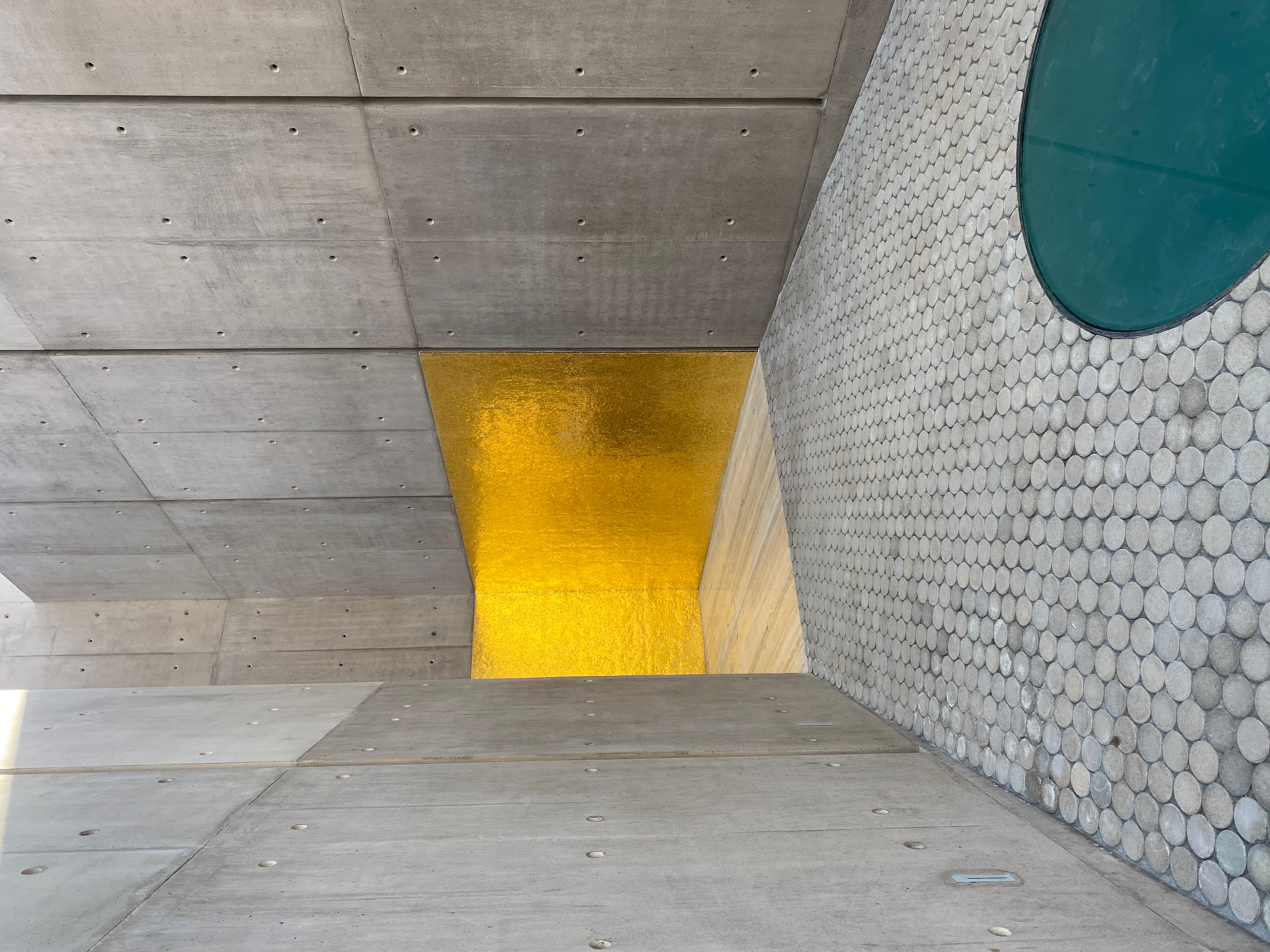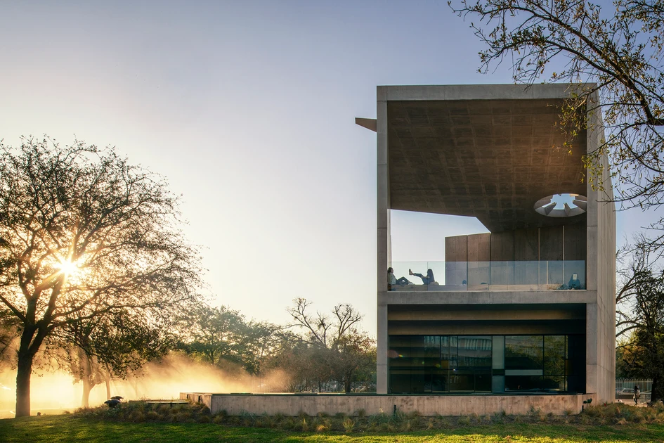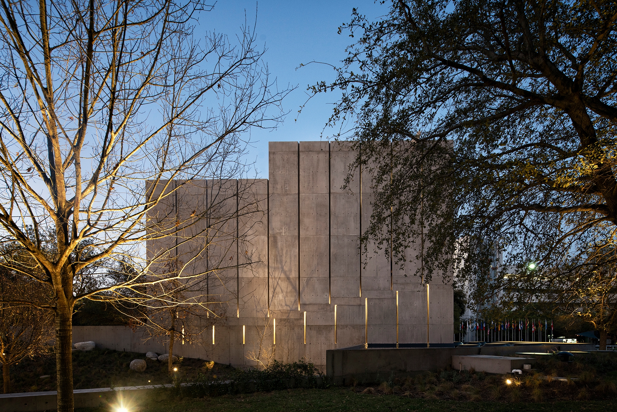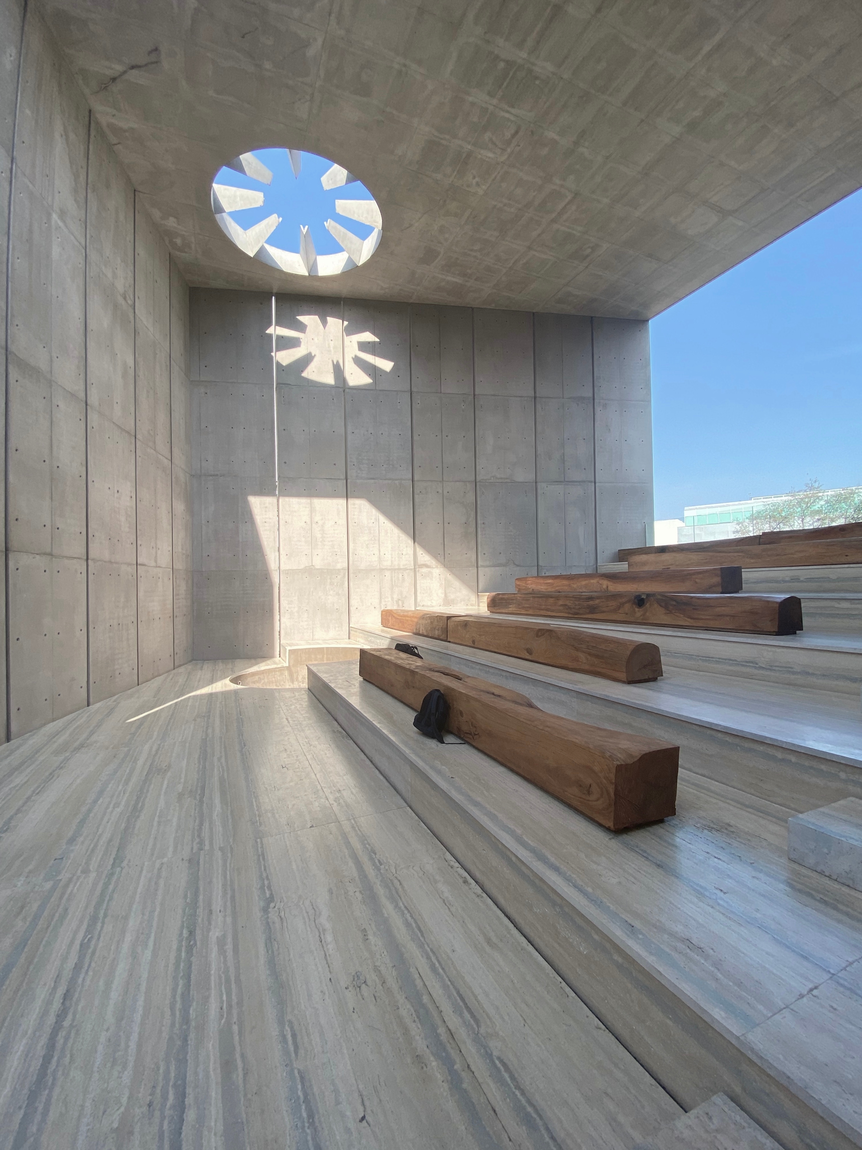 Continuing like a spiral around the concrete structure, the promenade now unfolds through the play between the concrete planes, the marked sunlight and the shadow of the trees, sheltering different situations for a break within the routes of the campus, both for individuals and groups. This special relationship with the particular light of Monterrey is achieved thanks to a special shade of concrete developed together with CEMEX.