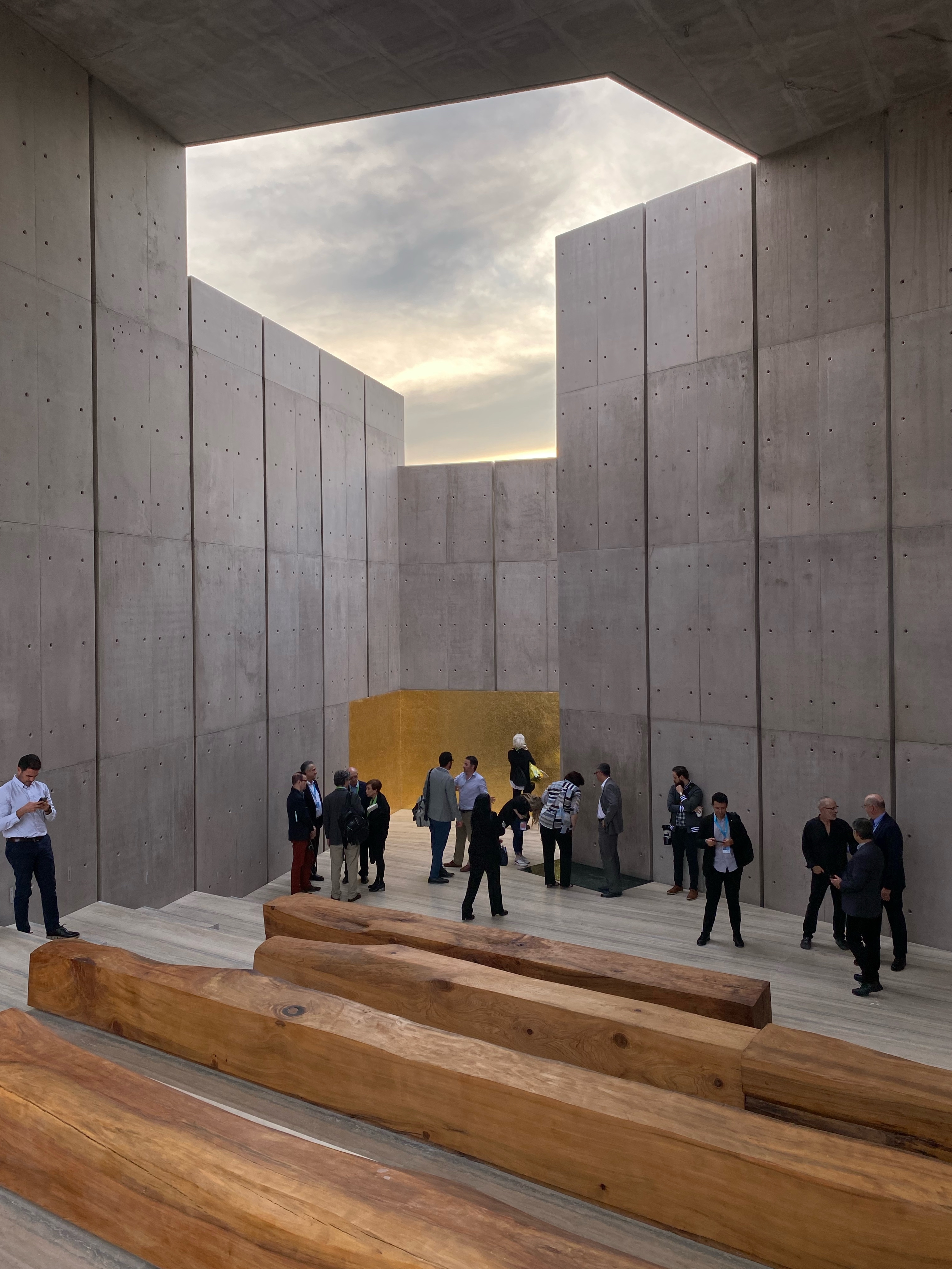 The promenade starts at the bottom of the plinth, where a small space surrounded by heavy curtains is able to take the user out of context. The silence seems to slow down time, creating a unique space for reflection. Throughout the plinth, a controlled height and filtered natural light take advantage of the play of shadow and light to create adequate spaces for meditation.