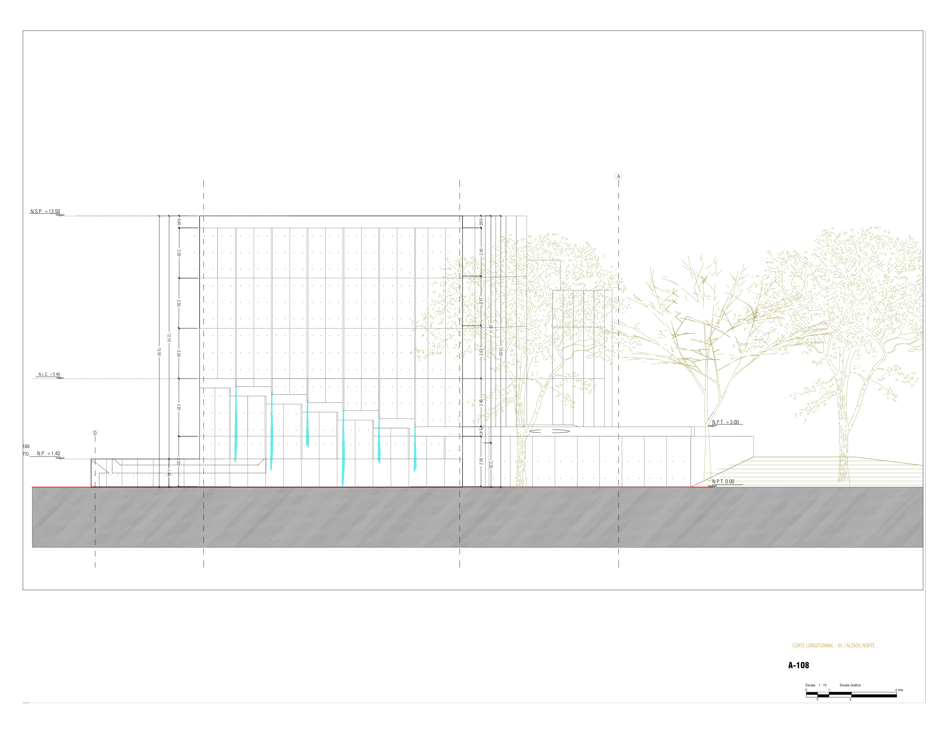 Completely abstracted from the campus environment, visitors are placed in this new context where a waterfall from the upper plane creates an atmosphere that takes one out of context. And this is how the end of the promenade is reached, an agora of monumental scale that achieves the same effect as the first small space of the plinth, but in the opposite way.