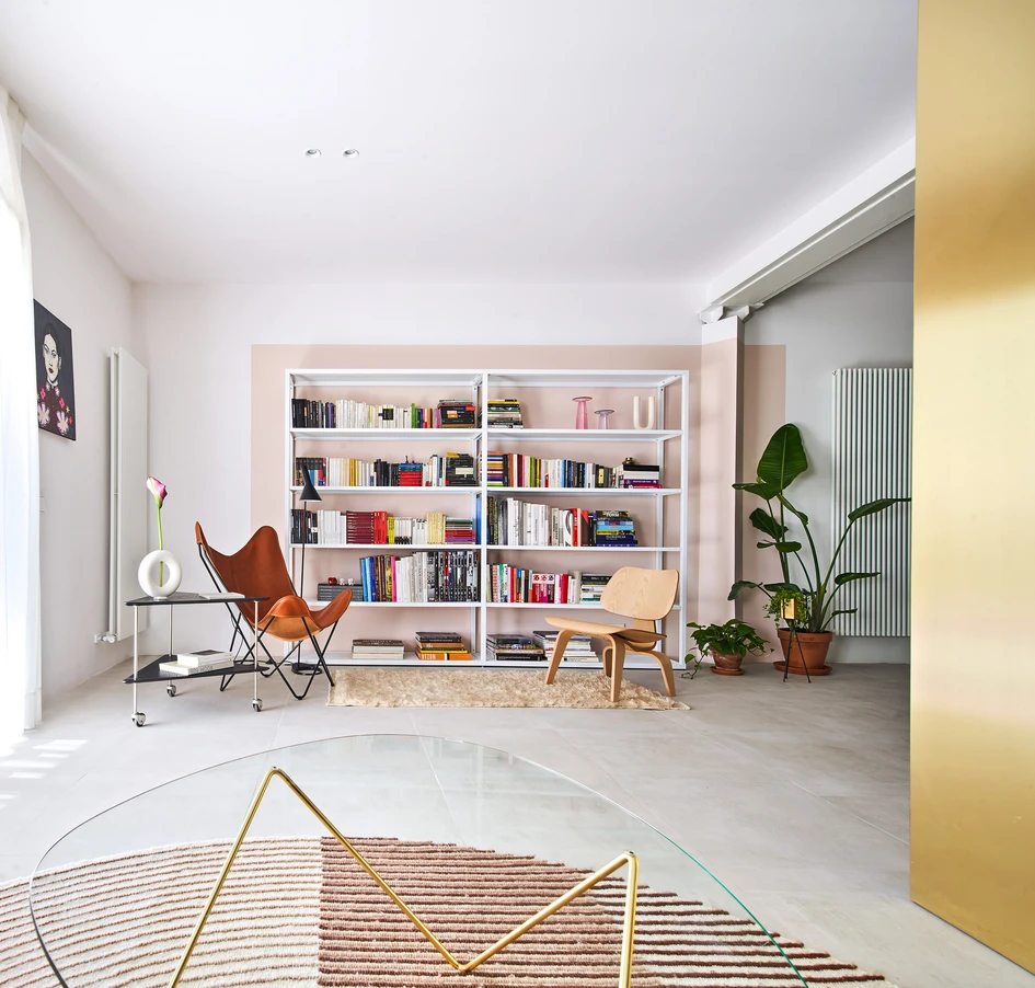 Given the simple spatial distribution, the materials come into play to multiply the sensations and increase the spatial complexity. A continuous strip of oak wood stained black with an open pore runs through several walls of the square space, up to the height of the triangle, entering it and finishing off the lower part of the kitchen. Thus, it is the material that unites initially separate spaces, and assimilates different functions with the same texture. This wooden stripe is interrupted by the doors of the rooms, made of stainless steel, flush with the wood, and this same material finishes off the upper parts of the kitchen. The rest of the environment in the central space is mostly painted white, with the exception of the wall of the bookcase, with a trimmed background of pale pink, which is the same color that is found on the floor and ceiling of the triangle. As a remnant/vestige of the existing structural system, the central pillar is covered with brass, again up to the height of the false ceiling of the triangle, highlighting the importance of this element as a configurator of the space, but also as a structural support for the reinforcements executed.