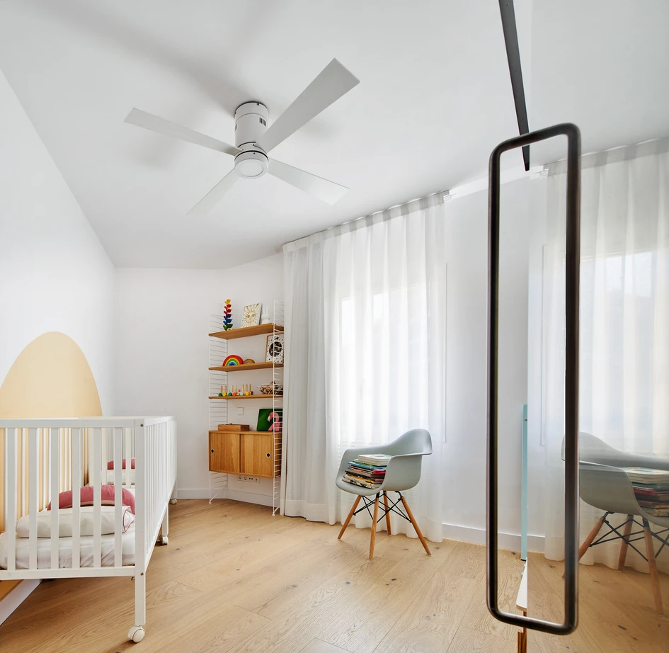 The square is the central space of the residence, which brings together the kitchen, the living room and the dining room, and freer spaces for the library, reading area, play area ... It is the space that is intended to be the heart of the house. This figure is inserted by knocking down the structural walls of the house, carrying out an important work of structural reinforcement, of which a corner of the old walls remains, almost centered, necessary for structural reasons, but also for spatial ones. This corner/pillar is a subtle division between the kitchen/dining area and the rest of the space, it is a very small limit, but enough to hint at a possible use of the spaces. Adjacent to the square is the triangle, with no physical separation between the two, but the lower ceiling indicates a transition of spaces. This triangular space gives direct access to the rest of the rooms: the two bedrooms (one with an en-suite bathroom) and a second bathroom.