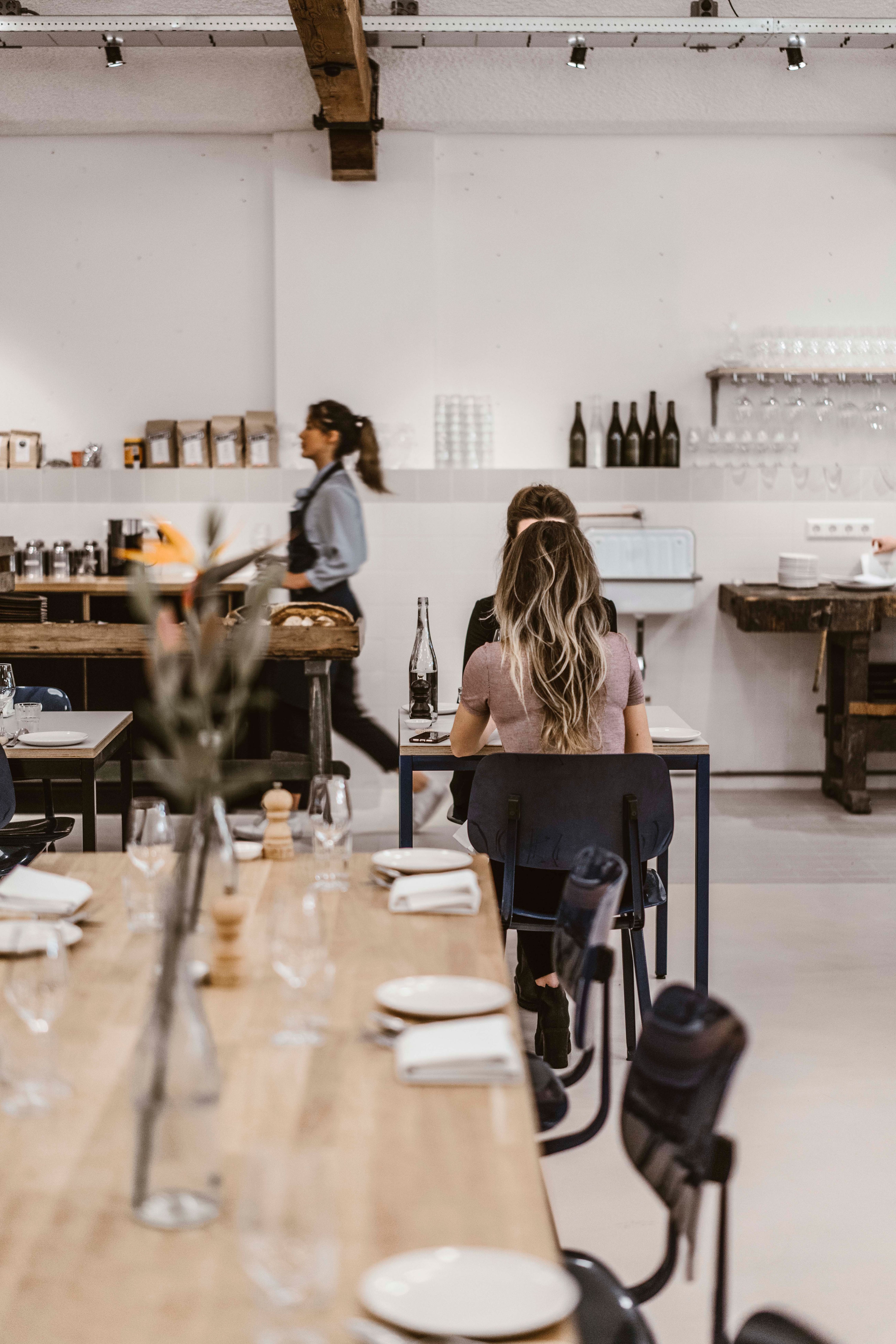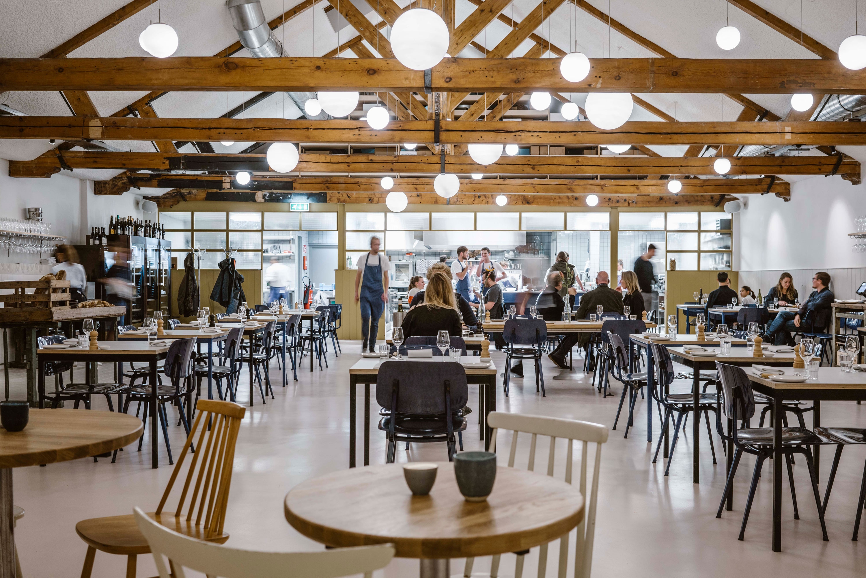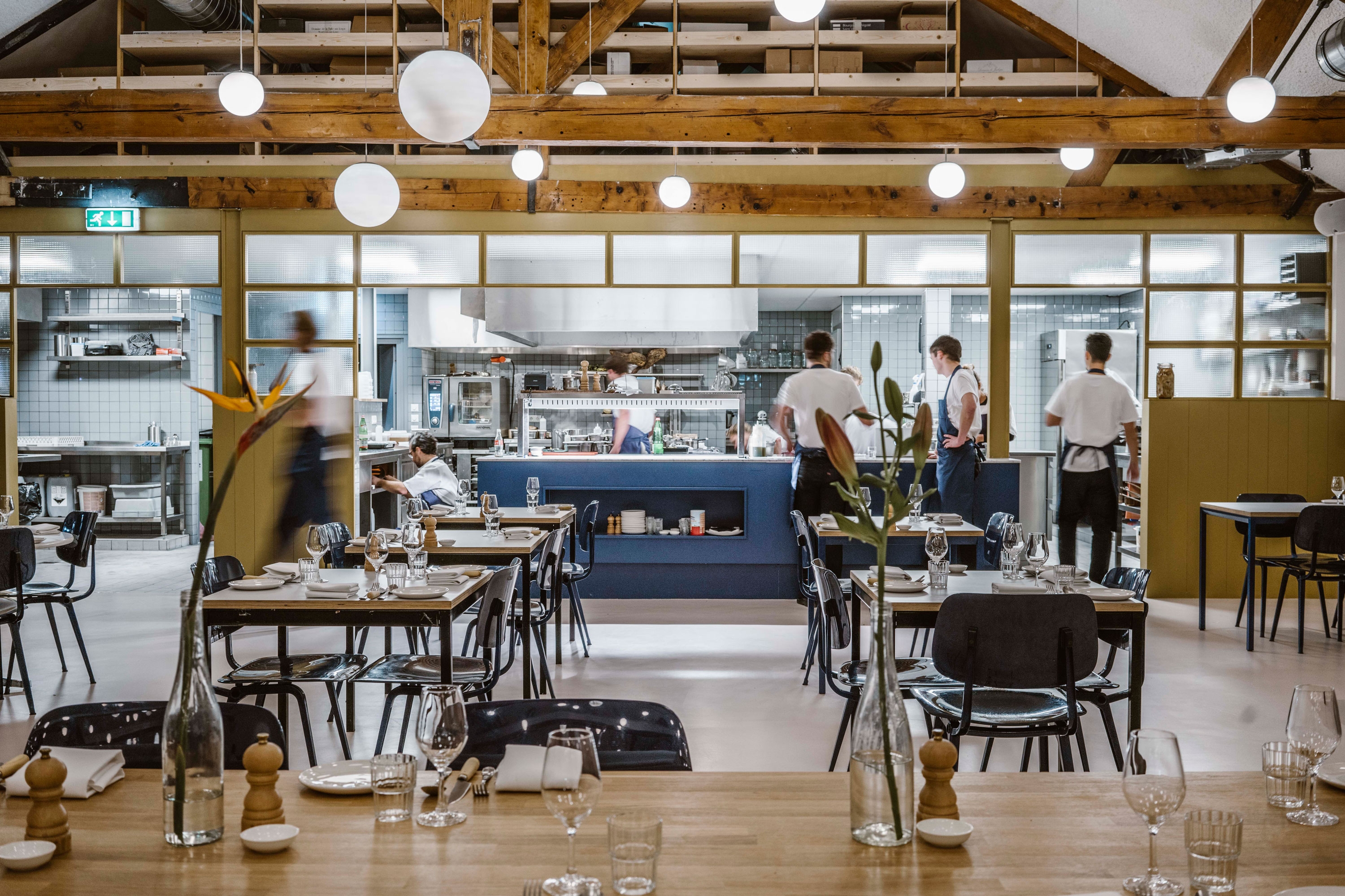 The large space is completely open, with the open kitchen positioned in the back of the restaurant. The front of the space is allocated as the café and bar area, and is separated from the restaurant by a billiard table as a reference to the original use of the space as a billiard hall. The restaurant seating is completely free flow, depending on the mix of reservations. The large kitchen is almost completely open to the restaurant. Ochre painted frames with wire glass create a subtle border between the kitchen and the restaurant.