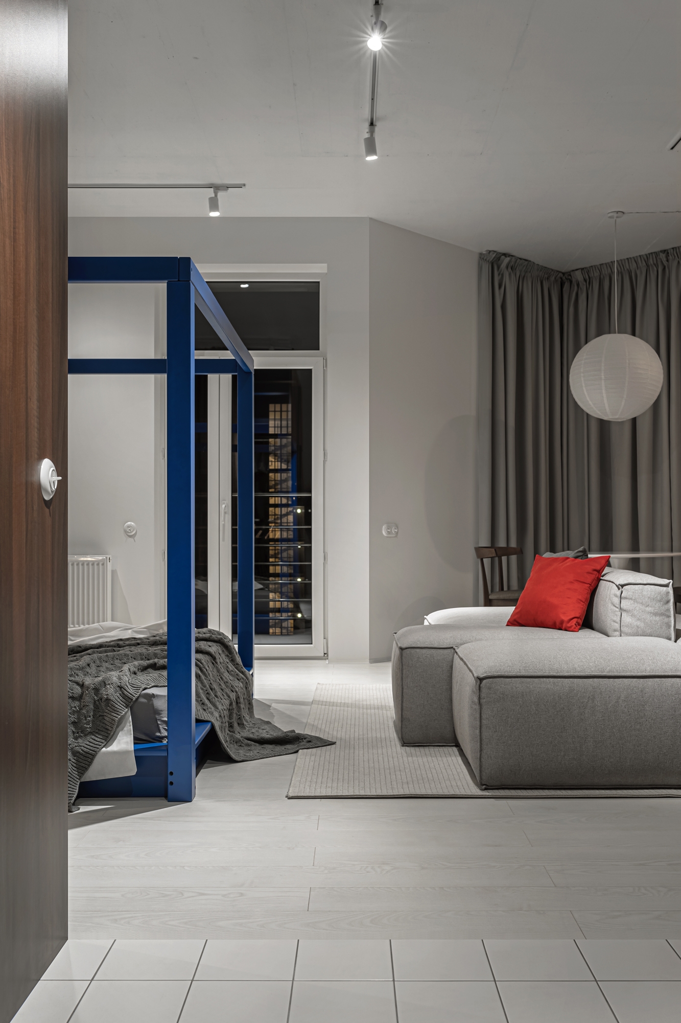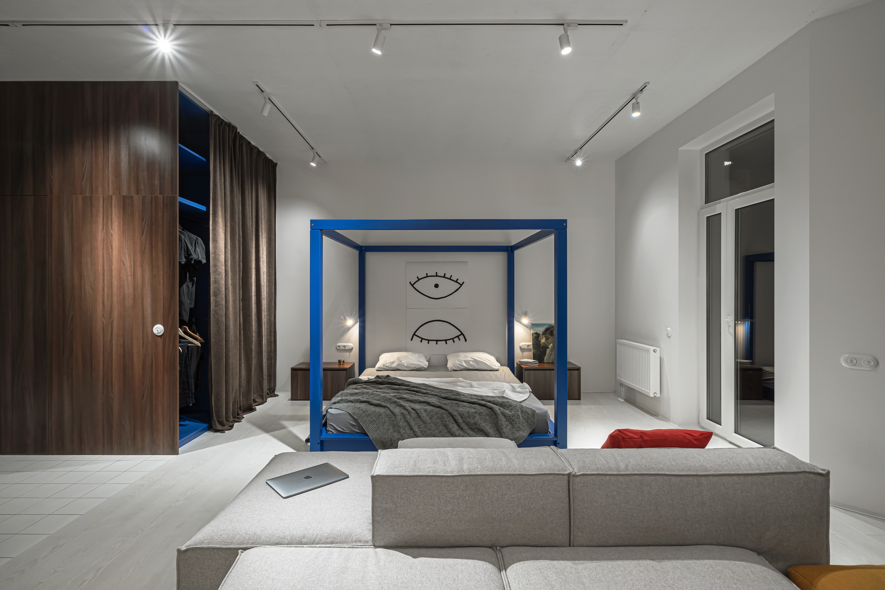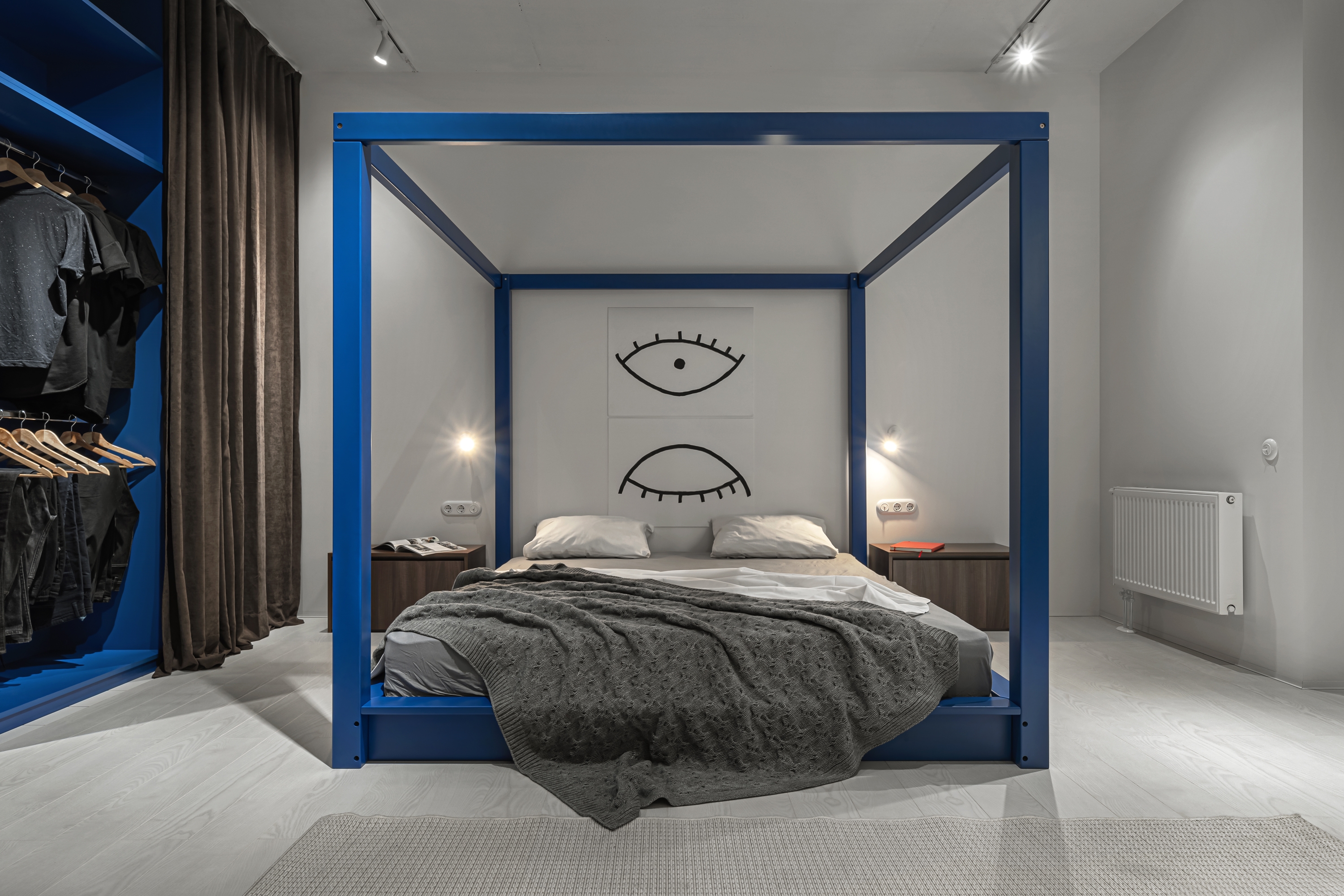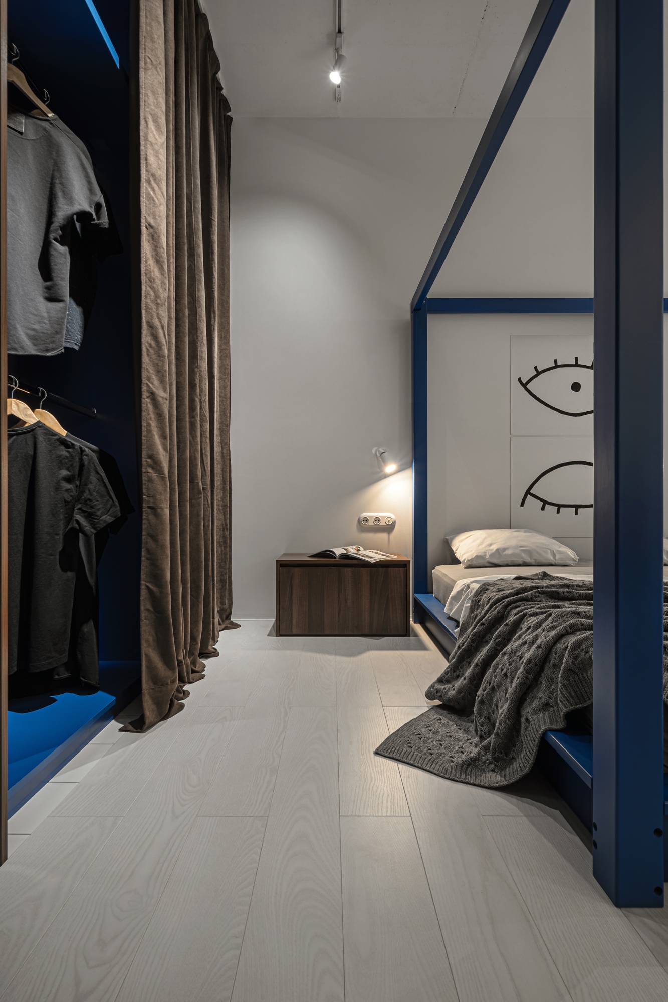 The best option for us was a cube-shaped bed from the Ukrainian company Vavilon, which visually highlights the sleeping area. To complement the bed, we have created a metal structure painted in blue.
