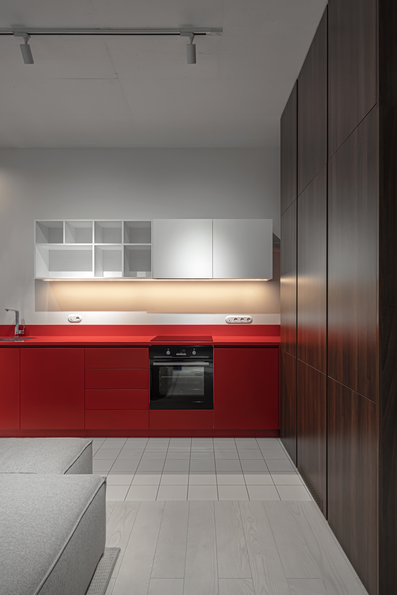 Initially, we planned to separate the kitchen area from the bedroom with a partition but we quickly realized that our idea on such a small area would not correspond to visual perception.