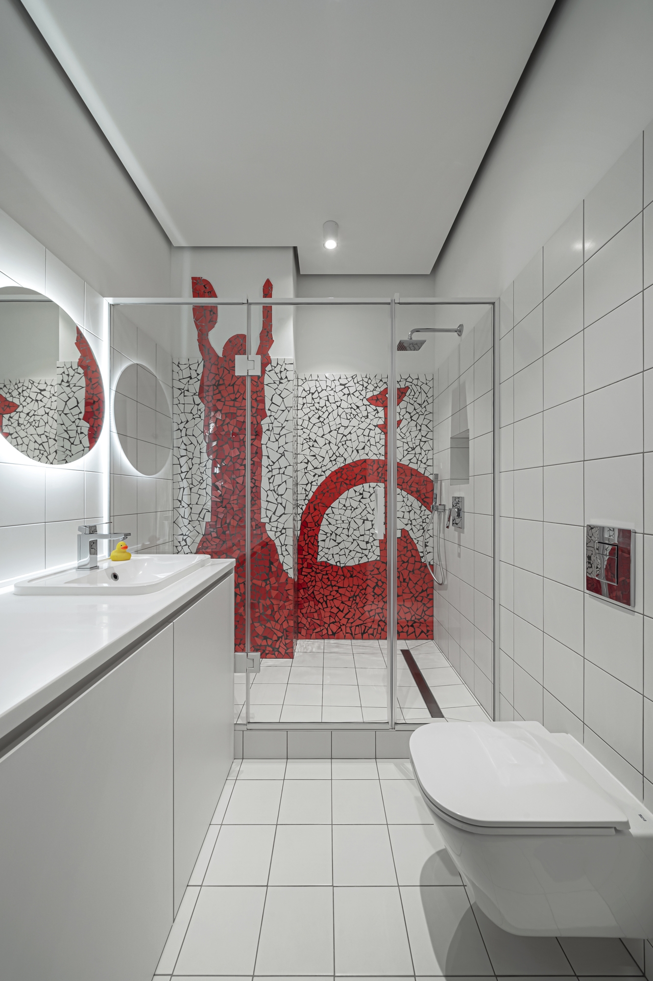A special feature of this project is a mosaic depicting the symbols of the city of Kiev in the bathroom, which we laid out ourselves. This was our first experience in working with tiles, but despite this, we managed to implement the planned drawing.