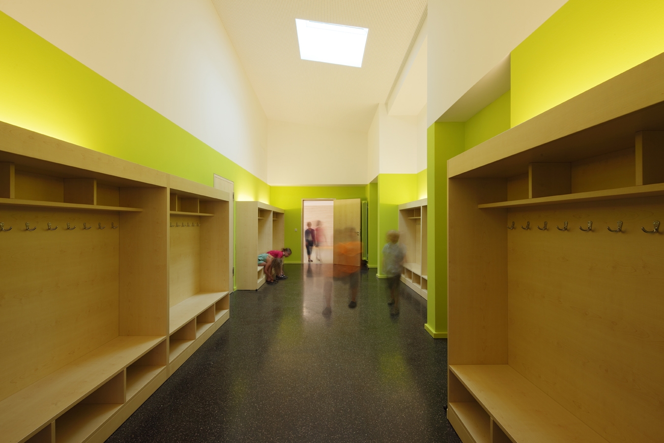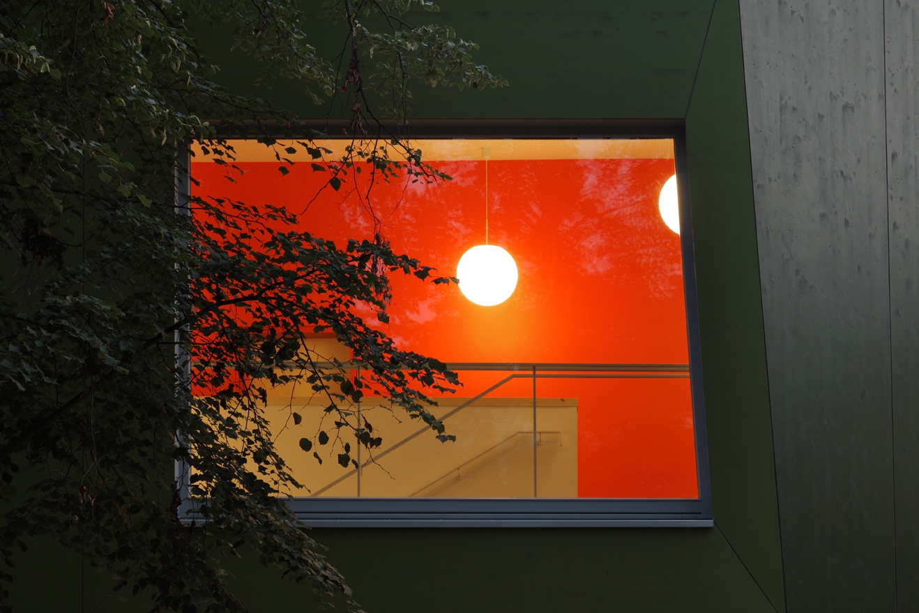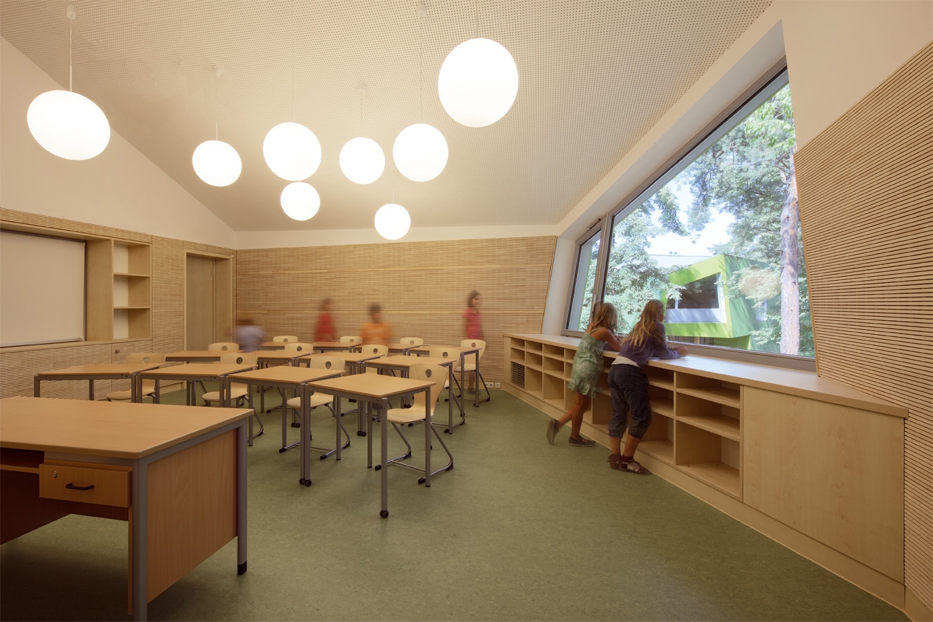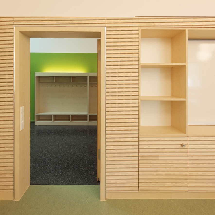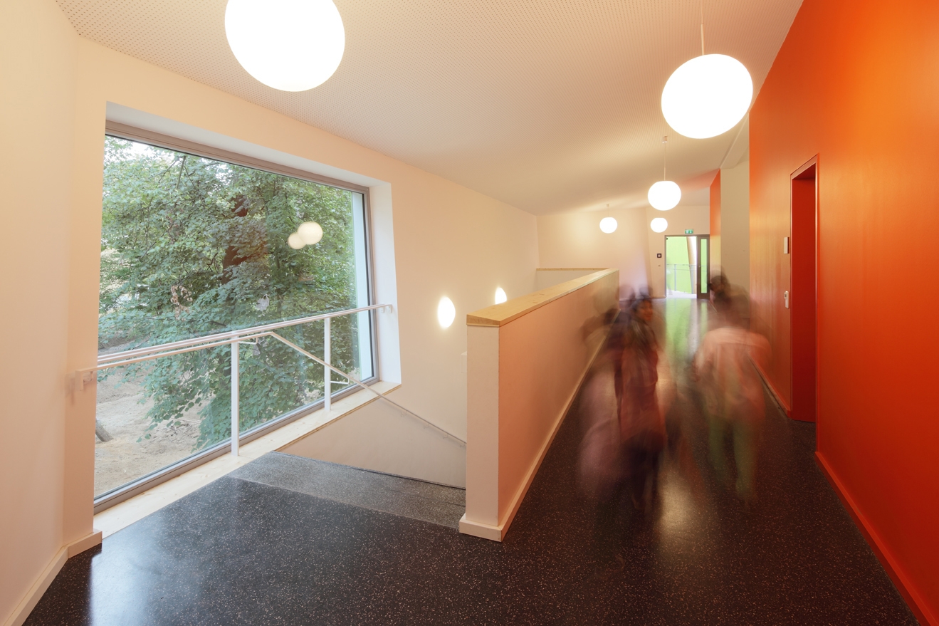 Die Funktion einer Sprachheilschule bedingt erhöhte Anforderungen an die Akustik der Klassenräume und wurde durch polygonale Raumzuschnitte berücksichtigt.