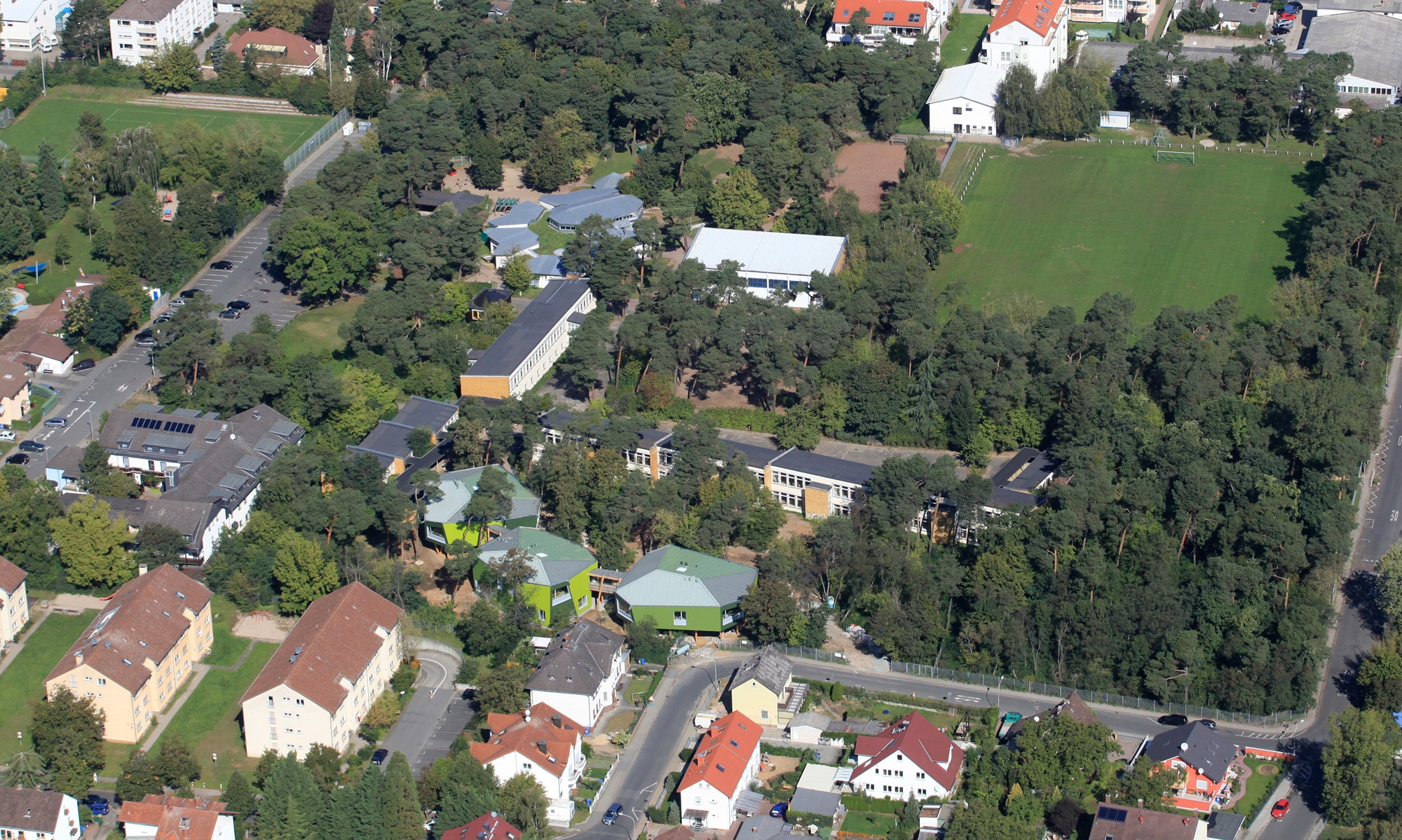 Um möglichst viele Bäume des Waldes zu erhalten, das Spezifische der „Schule am Kiefernwäldchen“ mit ihrem Namen herauszuarbeiten und der Grundstückssituation mit dem Wald baulichen Ausdruck zu verleihen wurden 3 kompakte Baukörper in Form von „Baumhäusern“ entwickelt.