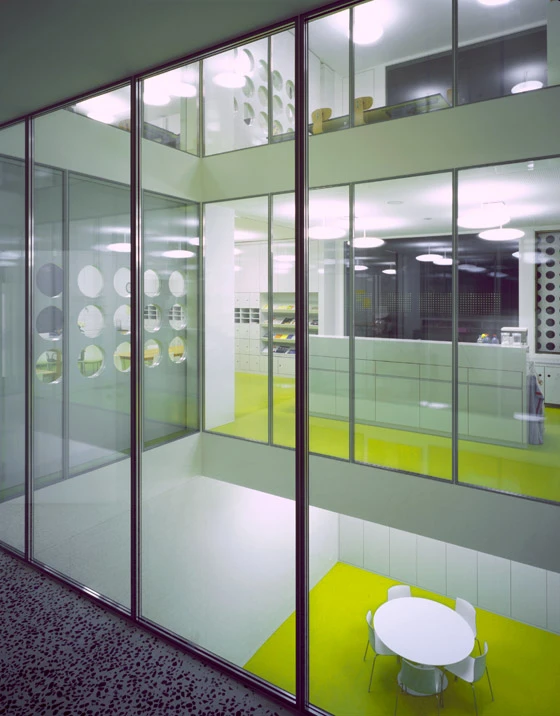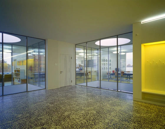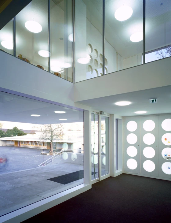 Die drei Geschosse des Schulhauses werden jeweils um einen zentralen, natürlich belichteten Hallenraum angeordnet. Dieser Raum ist einerseits vielseitig nutzbar (Miniaula, gemeinsame Projekte, Innere Pausenhalle, etc.), und vernetzt andererseits die Geschosse über Durchblicke räumlich miteinander. Die innere Fassade dieses Raumes ist aus verschieden transparenten bis opaken Glaselementen gefügt, und erlauben oder verwehren so je nach Nutzung Einblicke in die dahinterliegenden Räume. Diese Auskleidungen aus Glas finden sich als wiederkehrendes und verbindendes Motiv in zentralen Innenräumen aller drei Etappen.