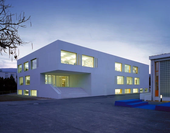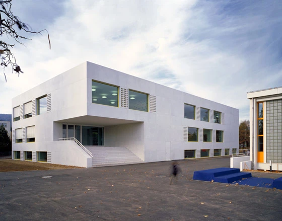 Die bestehende offene Hofanlage wird im Südwesten mit einem weiteren Solitär ergänzt. Der Eingang ist dem Hof, dem Zentrum der Anlage zugewendet. Im Hochparterre befindet sich eine grosszügige Foyerhalle, der Lehrerbereich, sowie über eine gemeinsame Küche verbunden Saal und Mittagstisch. Im Obergeschoss finden bis zu sechs Klassenzimmer mit jeweils angehängtem Gruppenraum Platz. Im Souterrain befinden sich, angeordnet um die natürlich belichtete Werkhalle die Handarbeits- und Werkenräume. Die Anordnung der Räume ist so gewählt, dass auch im Zusammenhang mit der Umnutzung der bestehenden Schulräume eine grösstmögliche Flexibilität gewährleistet werden kann.