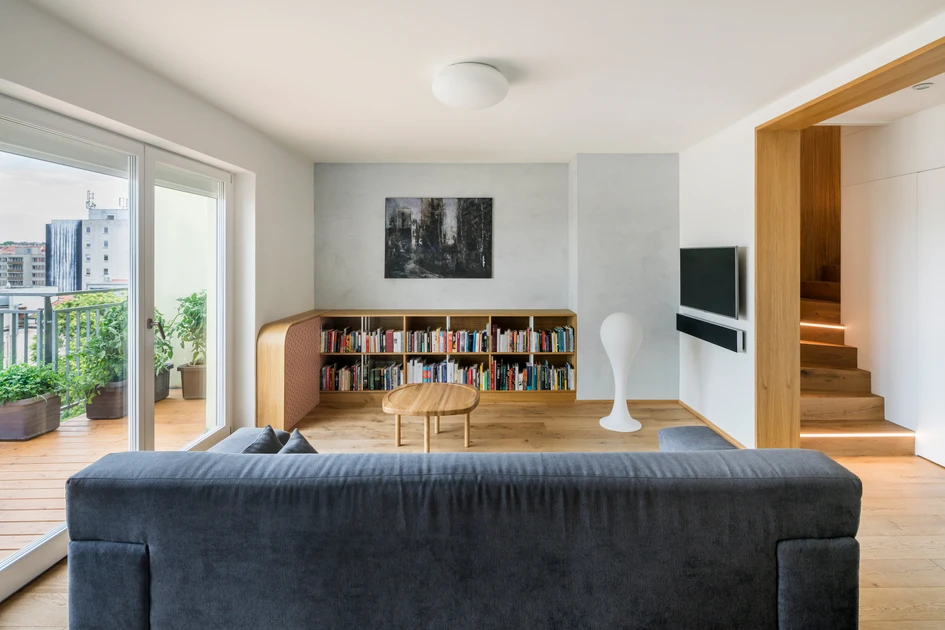 One group of people accept contemporary art as mere home decoration. Another group of people - collectors - can value contemporary art. However, their homes are cluttered and turn into art depositaries. Finally, there is the third group of people who, although not necessarily collectors, have fine pieces of art in their homes that bring them joy and pleasure. The reconstruction of a maisonette in Žižkov was designed to give some fine pieces of art a respectable living space.