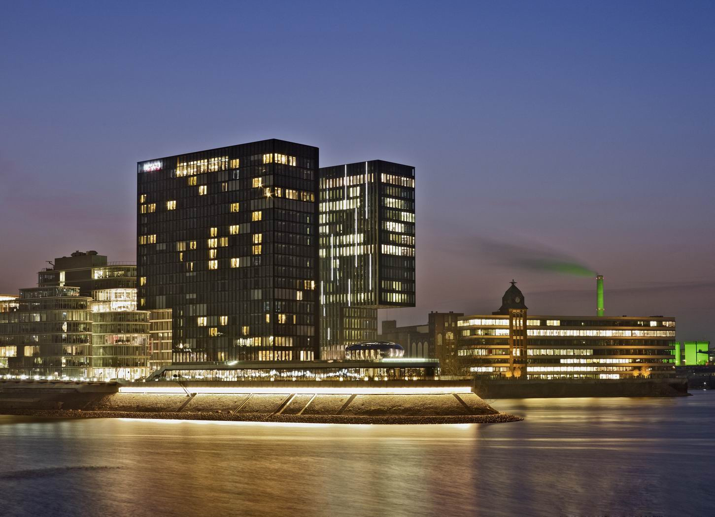 Das Design Hotel Hyatt Regency steht an der Spitze des Hafenbeckens im Düsseldorfer Medienhafen, einem der architektonischen Aushängeschilder der Stadt. sop architekten realisierte hier das Gesamtkonzept der Hafenspitze an der Speditionstraße, das eine Fußgängerbrücke, zwei verglaste Zwillingstürme, einen Pavillon und ein siebengeschossiges Bürogebäude umfasst.