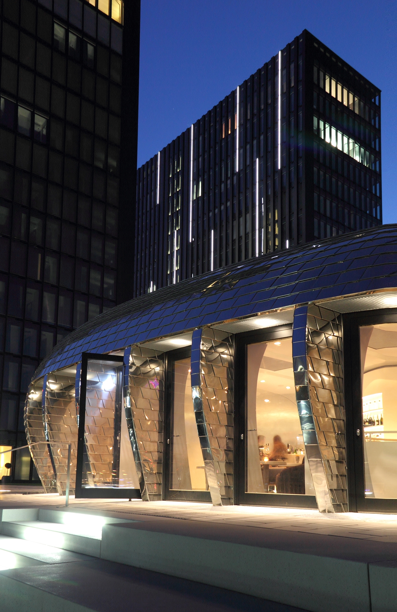 Dank eines mobilen Treppenelements im Mittelteil der Freitreppe verfügt der Saal über einen separaten Eingang. An der Spitze des Plateaus steht ein rund 4,50 Meter hoher, ovaler Pavillon, der als Hotelbar genutzt wird. Die metallische Außenhaut des von den Architekten getauften „Pebbles“ besteht aus glänzenden Aluminium-Schindeln, die das Tageslicht reflektieren. Die verspielte Architektur des Pavillons kontrastiert den reduzierten Baustil der Zwillingstürme und schafft am Ende der Landzunge eine Verbindung zu Frank O. Gehrys skulpturalem Gebäude-Ensemble im neuen Zollhof, das sich auf der anderen Seite des Hafenbeckens befindet.
