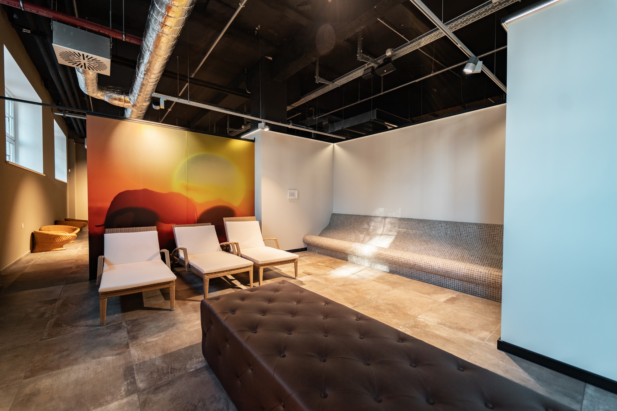 Der Sportbereich des ganzheitlichen Clubs umfasst verschiedene Fitnessangebote, Gruppenkurse und Radfahrprogramme. Aber auch der Spa-Bereich kann sich sehen lassen: drei außergewöhnliche Saunen, für die Alpha Wellness Sensations auch die Außenverkleidung aus Gyproc und MDF angefertigt hat. Dazu der Technikraum, in dem sich alle Technik-Komponenten wie z. B. Dampfgeneratoren und Steuersysteme befinden.