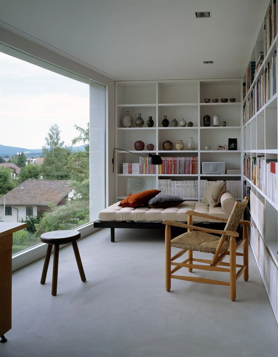 Die Grundrisse im Erd- und 1. Obergeschoss sind um einen zentralen Treppenhauskern angeordnet, der sich in Anlehnung an das Volumen nach oben auflöst. Die beiden oberen Geschosse beherbergen eine Wohnung, deren Layout für die Ansprüche eines Designsammlers entwickelt wurde. Auf der ersten Ebene befinden sich das Wohnzimmer und die Schlafzimmer. Über eine grosszügige Treppe gelangt man in das Attikageschoss mit Küche, Bibliothek und zwei Terrassen. Eingebaute Blickachsen gewährleisten, dass die Designobjekte in einem ausbalancierten Spannungsverhältnis stehen und gleichberechtigt miteinander kommunizieren können.
