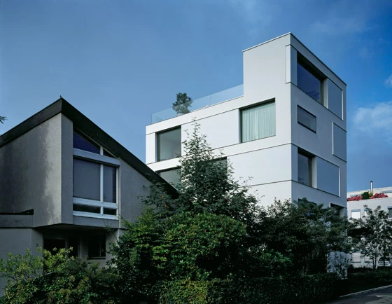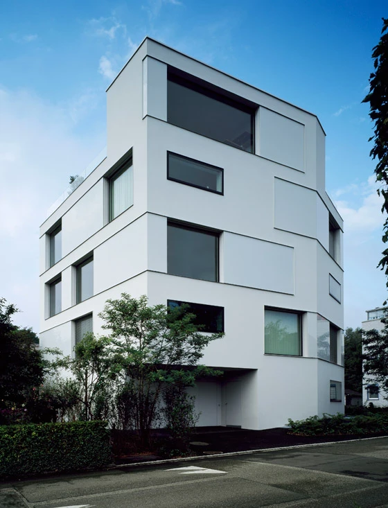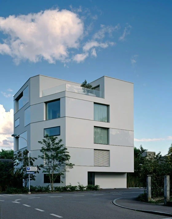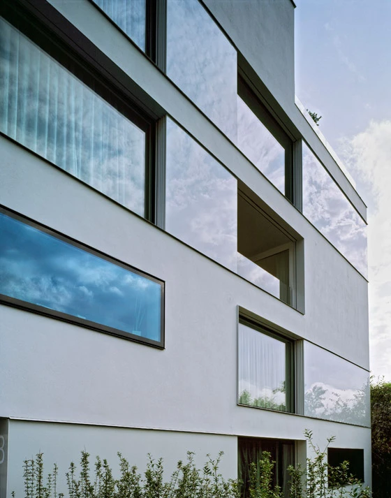 Auf den ersten Blick ein wohlproportionierter Baukörper mit glatt gestrichener, präzis detaillierter Putzfassade, der die exponierte Lage an einer Strassenkreuzung wohl besetzt. Nähert man sich dem Gebäude gewinnt das Volumen an Vielschichtigkeit. Zwei tiefe Einschnitte im Erdgeschoss akzentuieren die Eingänge. Die Ausschnitte zweier Terrassen im obersten Geschoss führen zu einer Betonung der Gebäudecke und die abgewinkelte, dem Strassenverlauf folgende Südfassade, verleiht dem Baukörper zusätzlich Dynamik. Grossformatige Fenster im Wechsel mit geschlossenen Bereichen, sind als über Eck laufende Bänder zusammengefasst und machen die Geschossigkeit des Volumens lesbar. Die Wandpartien dieser Fensterbänder sind mit emailliertem Glas in der Farbe des Putzes hinterlegt. Je nach Witterung spiegeln sich die Wolken in diesen Flächen und lassen die Fassade des Gebäudes in ein Wechselspiel mit der Tageslichtstimmung eintreten.