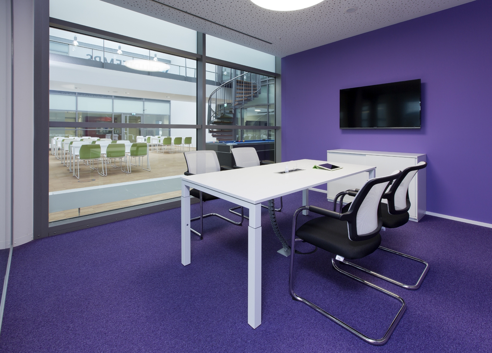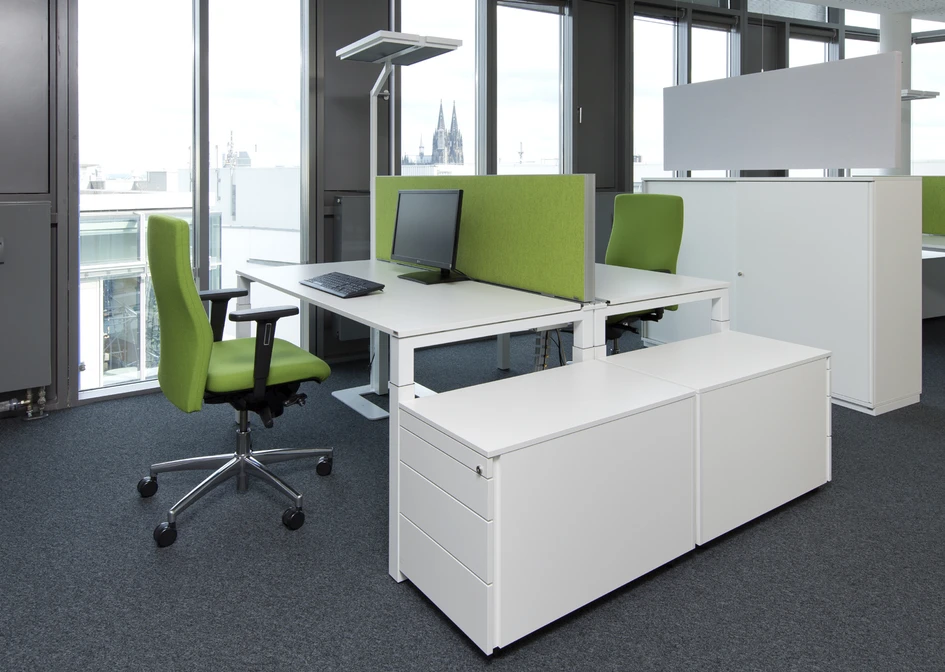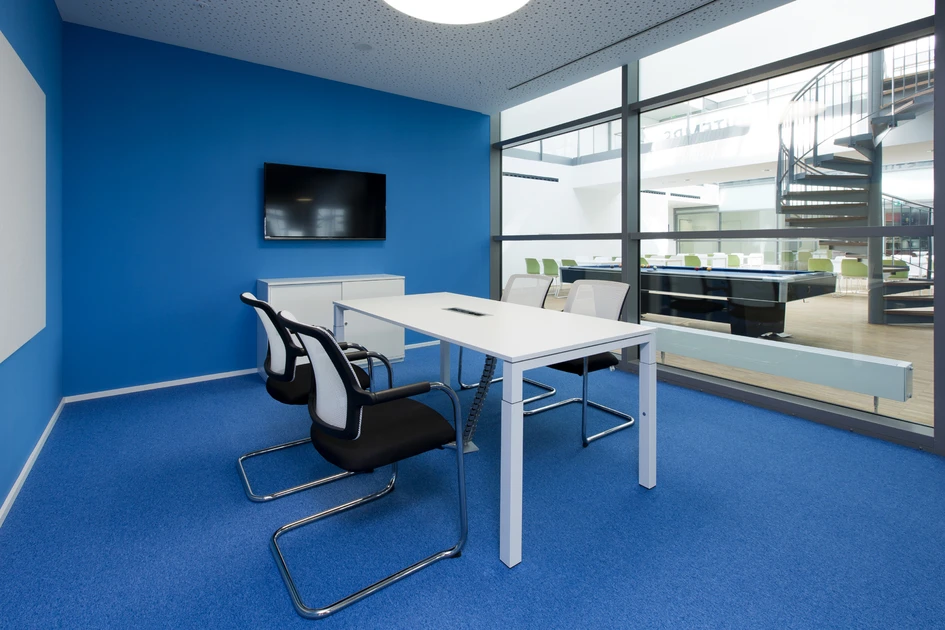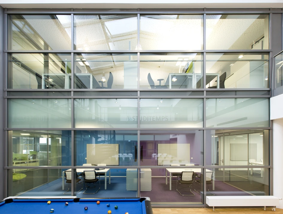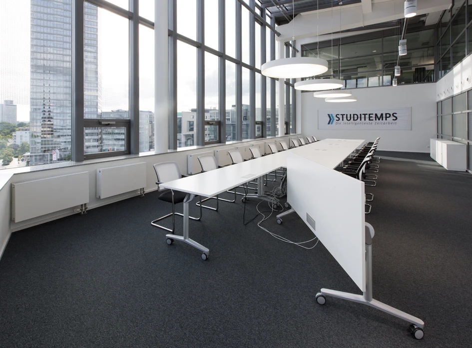 Für die Niederlassung der studentischen Personalvermittlung im Kölner Medienpark entwickelte das Architekturbüro Arctum ein Bürokonzept mit modernen Open-Space-Strukturen über drei Etagen. Auf über 2.000 m2 wurde hier eine farbenfrohe, dem Corporate Design angepasste Einrichtungslösung realisiert – mit großzügigen Flächen für 4er-, 6er- und 8er-Benches, eine lichtdurchflutete Cafeteria inklusive Billiard-Tisch und verschiedene, durch Glas abgetrennte Rückzugsräume für Besprechungen oder die konzentrierte Einzelarbeit. Dank umfassender akustischer Maßnahmen und einer durchdachten Technikintegration bietet die neue Arbeitswelt den Studitemps-Mitarbeitern optimale Voraussetzungen für ein konzentriertes Arbeiten, aber auch für den kommunikativen Austausch.