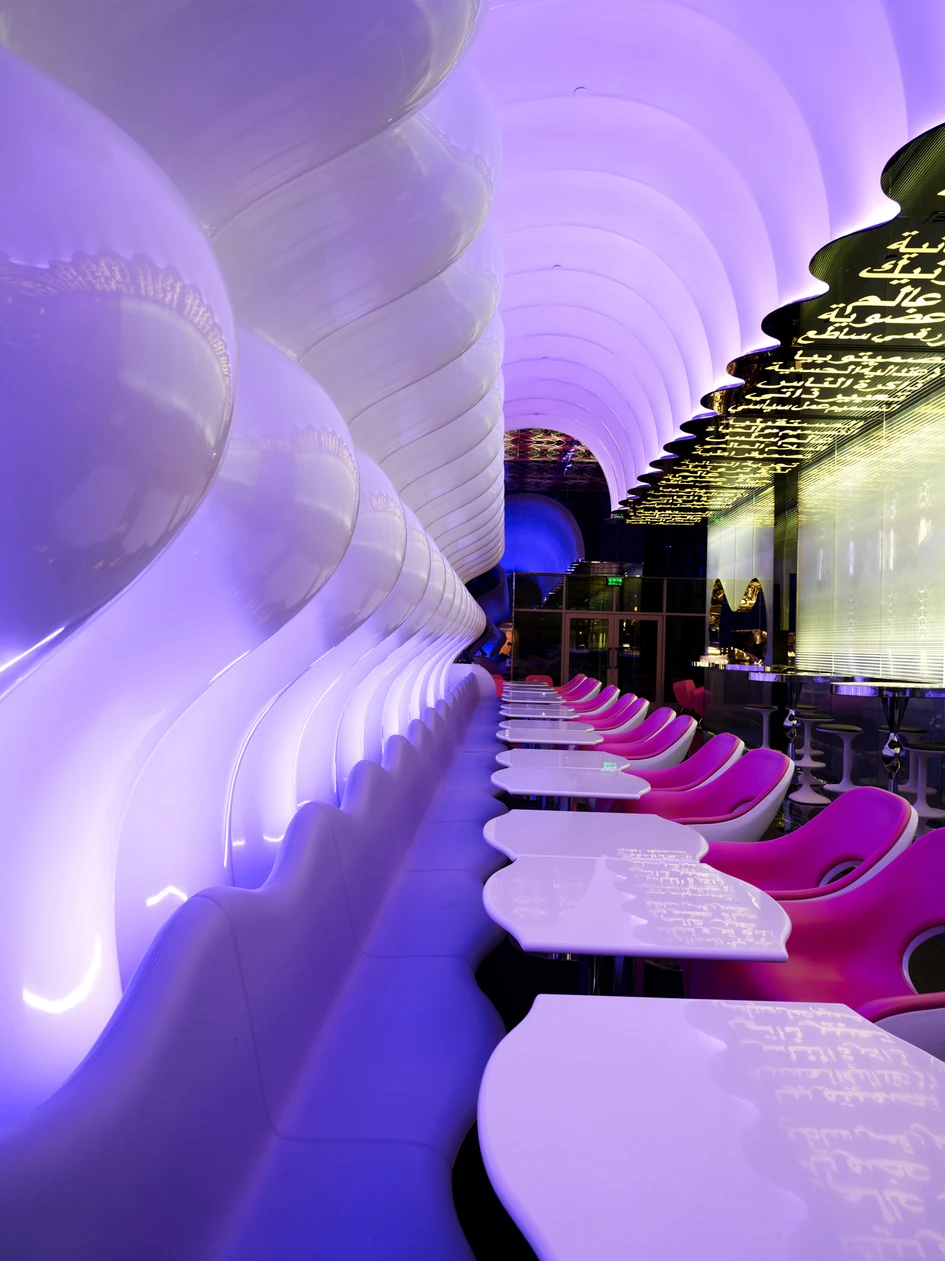 Colour changing wavy plastic walls shaping the space, luminescent Arabic writing enriching the ceiling, this visual masterpiece of the New Yorker artist fascinates and enchants every customer of this new luxurious restaurant, which has already become an icon of the United Emirates glittering metropolis.
