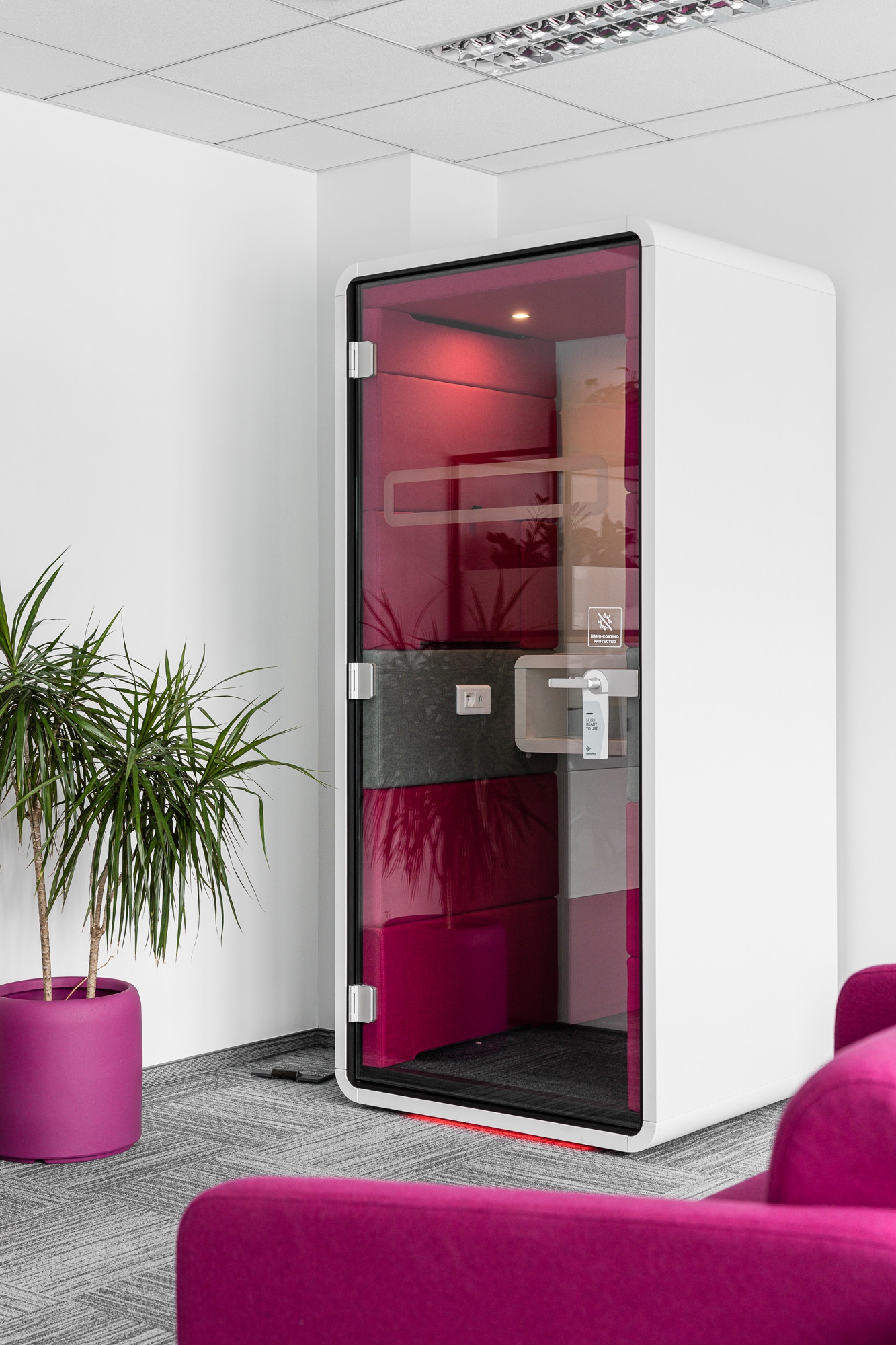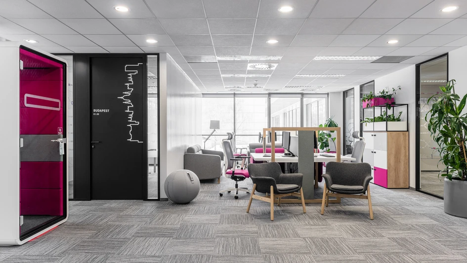 Das Ergebnis ist eine umfassende Büroeinrichtung von T-Mobile, die ebenfalls Teeküche, Chillout-Zonen und Konferenzräume umfasst. Noch nie waren unsere hushPhone-Akustikpods so genau auf das Geschäft unserer Kunden abgestimmt.
