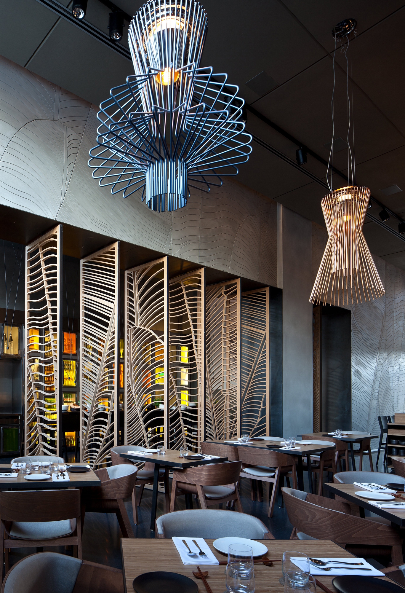 Although western culture serves as a major source of inspiration, Asia is heavily celebrated in the reinterpretation of traditional local food by chef Yuval Ben Neria and evoked through the interior and lighting design. Banana leaves motifs are incorporated into the restaurant’s design in major way. They’re imagery is on the dividing panels (Taizu is divided into various intimate spaces). This was done to underline the special character of the restaurant. Interior designers Sigal Baranowitz and Gali Amit have selected the light, ethereal lines of Foscarini's Allegro and Allegretto lamps for the dning rooms, communal areas and the distinctive wine cellar.