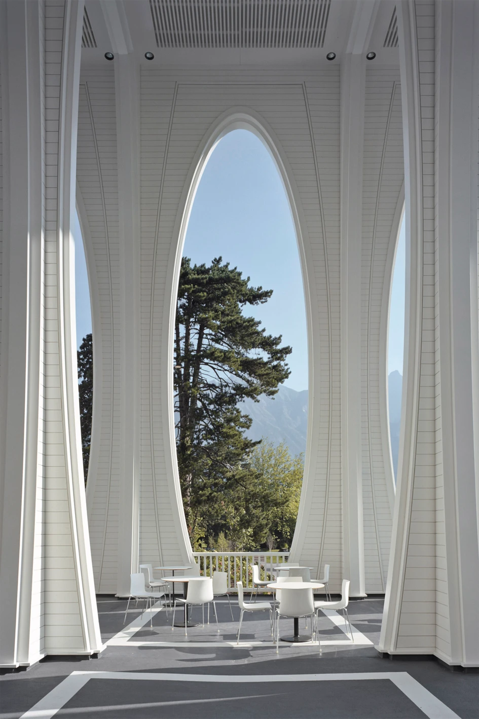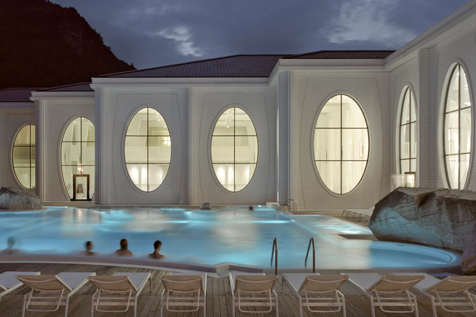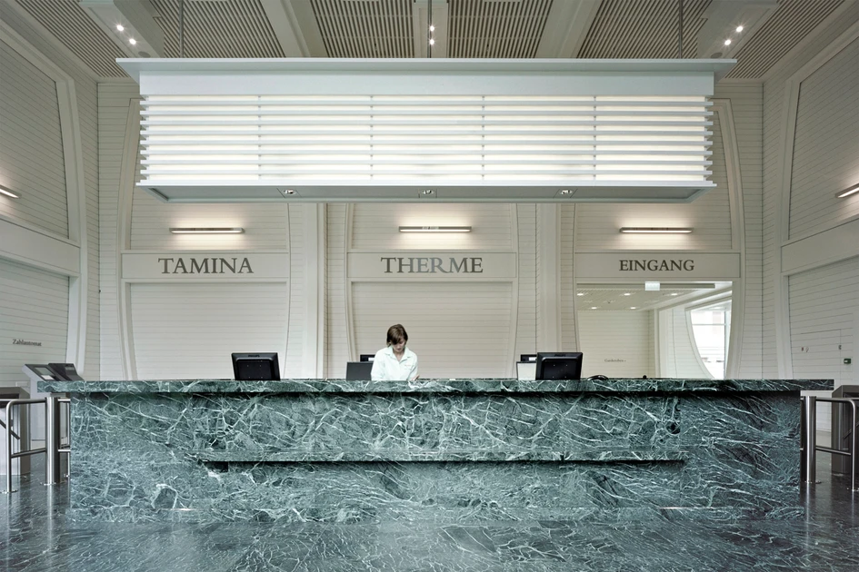 Trotz dichter Bebauung dominiert der Park das Grand Resort Bad Ragaz, das mehrere historische Fünf-Sterne-Hotels, Golfclub und Casino vereint. Die Tamina Therme als wichtige Komponente dieses Ensembles versteht sich in der Tradition der Grandhotels. Kulturell und ästhetisch werden Anleihen nicht nur bei den Luxushotels der Schweiz genommen, sondern ebenfalls der berühmten Ostseebäder wie Heiligendamm. Der monumentale Baukörper präsentiert sich ebenbürtig zu den anderen repräsentativen Bauten auf dem Areal, kontrastiert aber durch seine Materialität zum benachbarten Quellenhof mit seinem urbanen, steinernen Charakter. Das weiße Holzhaus mit den ovalen, formal verspielten Fenstern spiegelt eine pavillonartige Ferienarchitektur wider – mitsamt den Assoziationen zu Badeanstalten und Urlaub am Wasser. Im Innern wirken diese Fenster als überdimensionierte Bilderrahmen – ovale Rahmen waren zur Zeit des Biedermeier für Landschaftsveduten verbreitet.