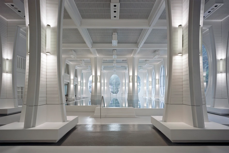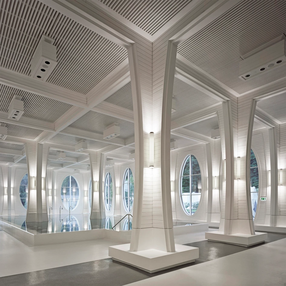 Die öffentliche Tamina Therme vermittelt im Innen- wie im Außenraum den gleichen Eindruck. Die schneeweiße Holzlattung des Gebäudes setzt sich im Innern als Wandoberfläche fort. Die insgesamt 115 Stützen der rasterartigen Holzstruktur schaffen ein räumliches Phänomen, das Schönheit und eine feierliche Atmosphäre erzeugt. Das Baden wird als eine kultivierte Handlung zelebriert.
