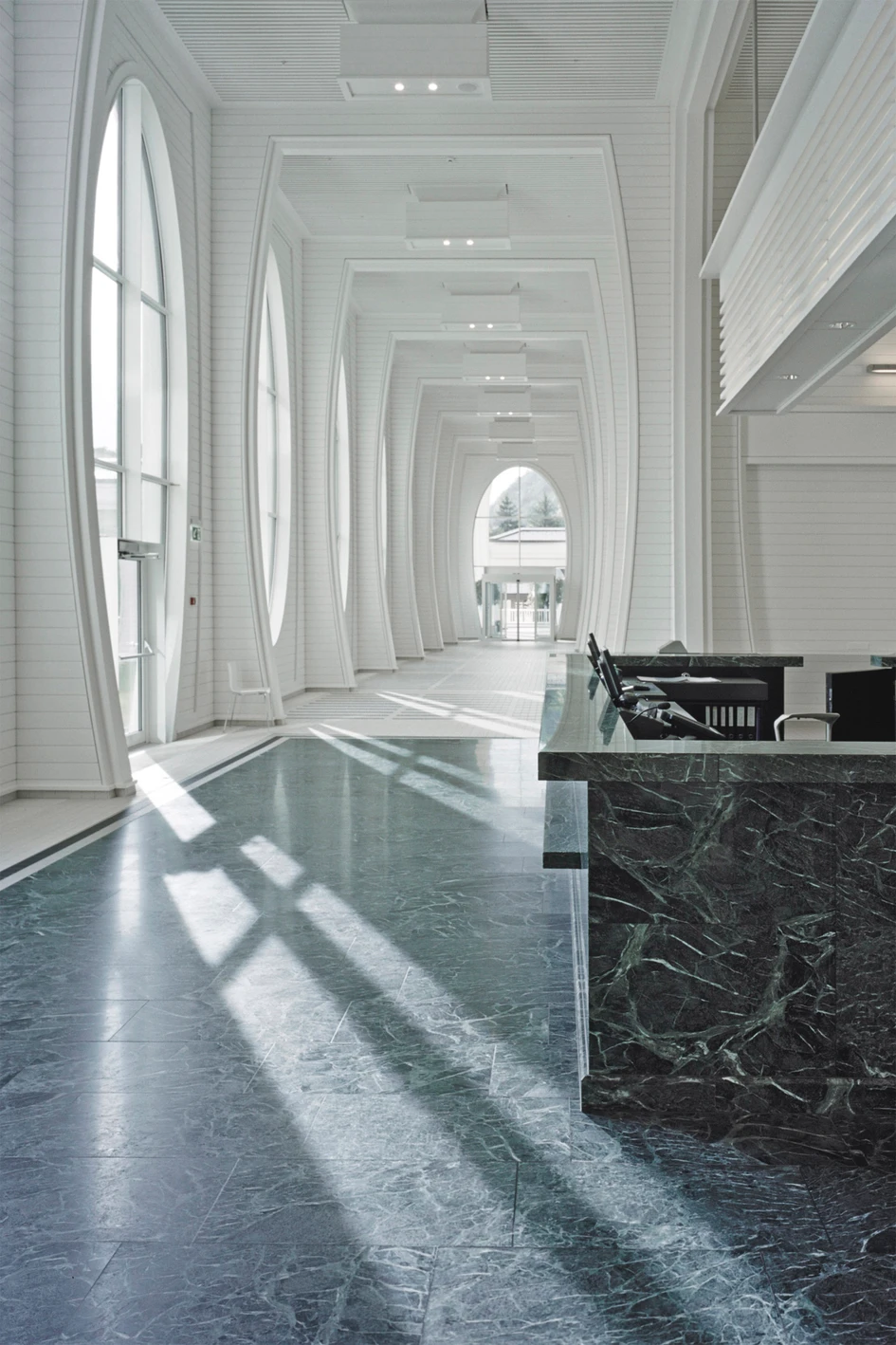 Die Tamina Therme als wichtige Komponente des Grand Resorts Bad Ragaz setzt mit ihrer weißen Holzfassade einen deutlichen Akzent. Im Innern überrascht die großzügige rasterartige Holzstruktur, die durch die Lichtlösung betont wird. Eine helle und offene Atmosphäre empfängt die Besucher.