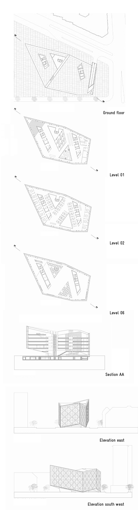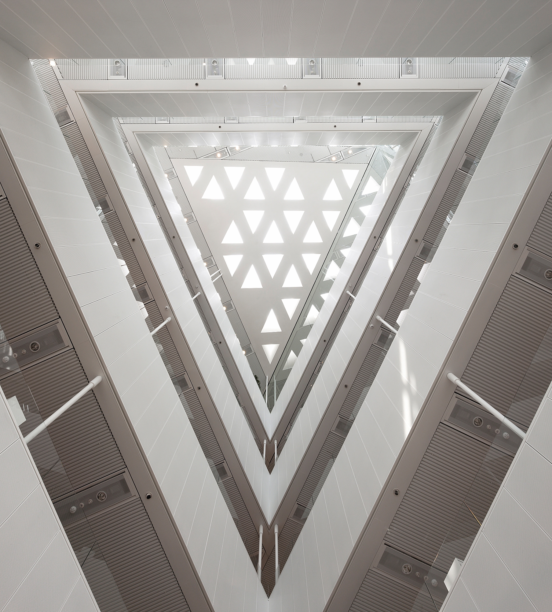 In terms of both form and scale, the building is intermediate between the city and the harbour, and harmonises with neighbouring buildings. On the southern side it rises with reference to the Elefanthuset’s gable apex and creates space for the main entrance. From the corner of Puggardsgade and Hambrosgade there is passage under the building and a clear view out towards Nykredit’s head office building, called the Glass Cube, and the harbour. The interior layout of the building has been designed for optimum functionality, flexibility and ef¬ficiency. The typical floor plan is disposed in a Z-shape around two atria, which ensures that all workstations are well lit and enjoy a view. The disposition of the plan allows the accommodation of open plan, separate offices or meeting rooms. The building is primarily supported by a rhombic construction system placed immediately inside the façade. The system functions both as an architectural element while also allowing the building to dispense with pillars.