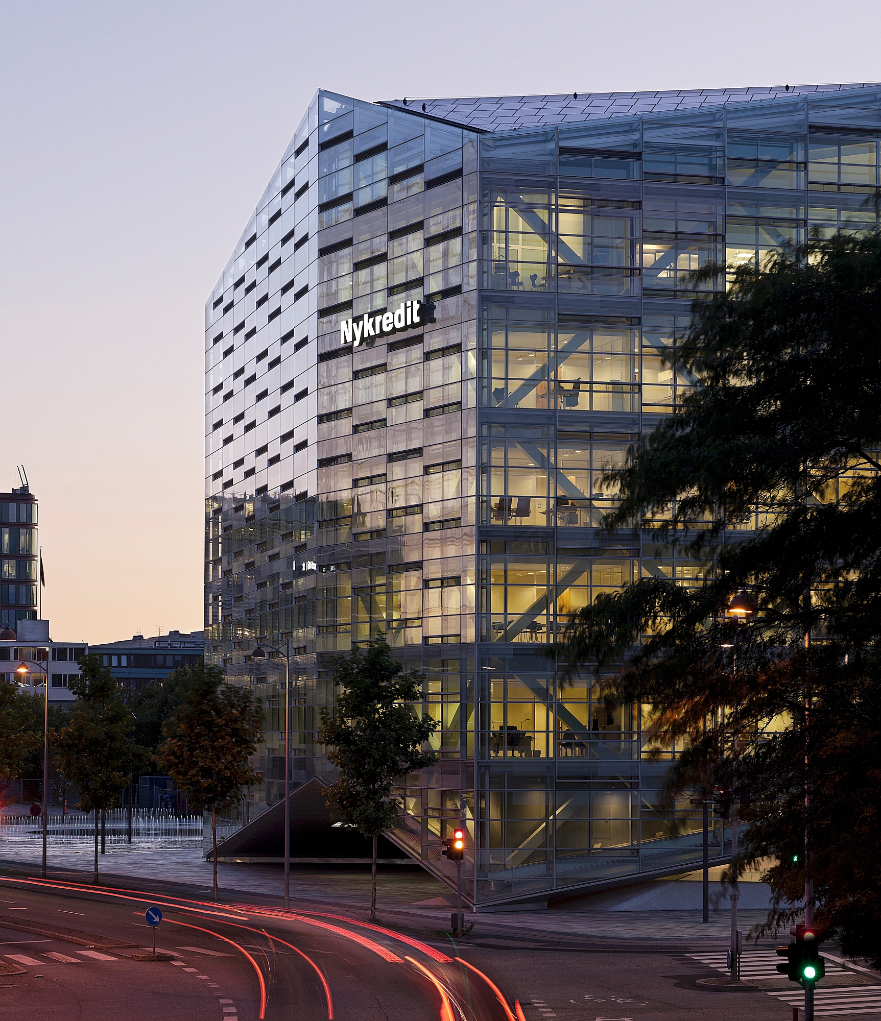 The extension to Nykredit consists of a new building – the Crystal – sited northwest of the existing Nykredit premises. Freestanding on the site, it reads as a transparent, geometrical, glazed form which, resting only on a single point and a single line, floats as a visually light, crystalline structure above the plaza.
