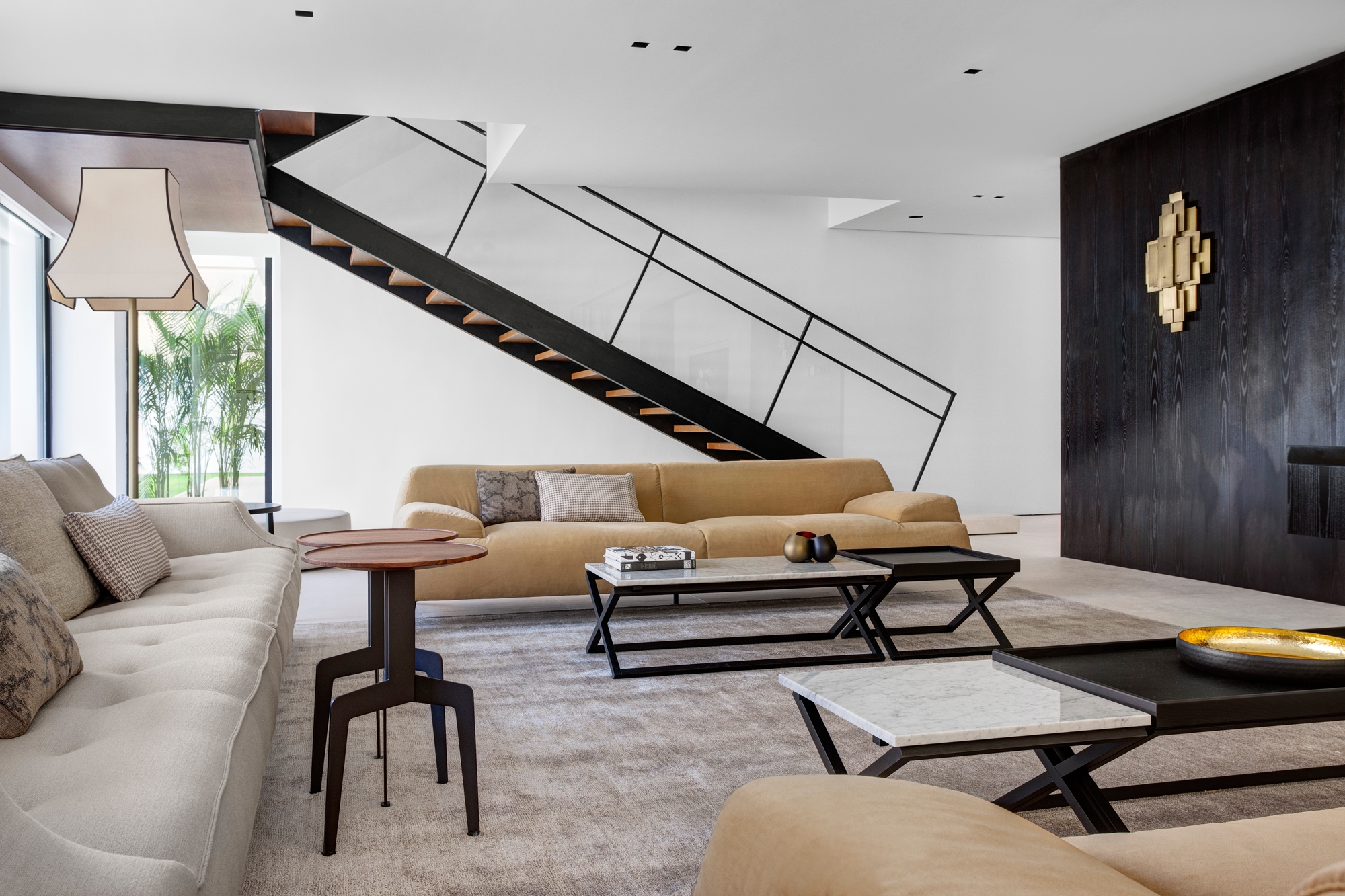 As per the client’s brief, the house should have two separate living rooms, a male and female majlas with two different settings where the later should be more feminine. In this room, the Rubelli sofa is accented with cushions by Hermes and wall sconce by Hamilton Conte. A steel structure staircase floating over a limestone platform creating an enviroment of minimal grandeur. In relaxing pallette of warm grays with subtle hint of red, the masterbedroom is designed as a modern hotel room.
