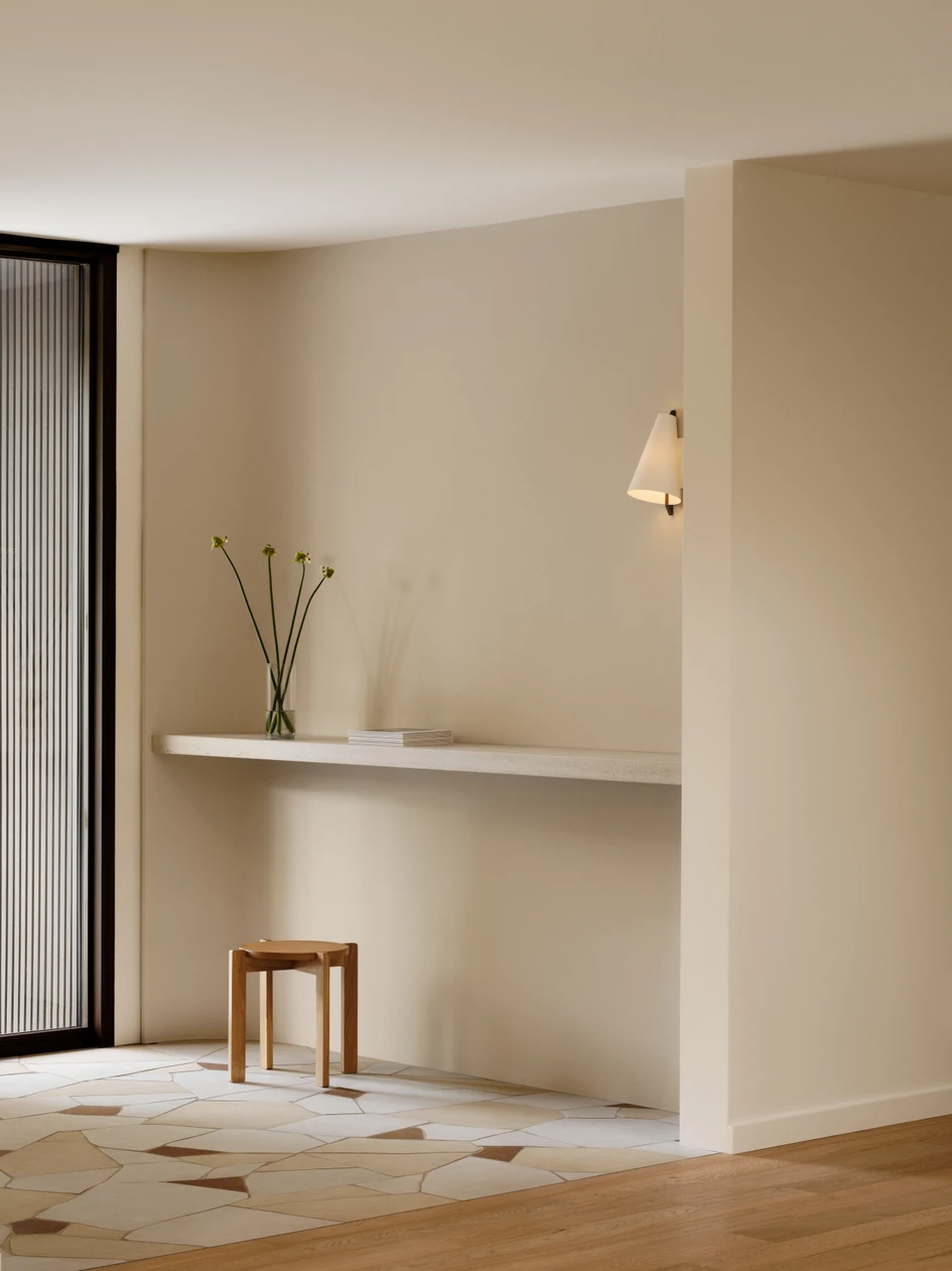 White oak, used transversely, clads the boudoir’s bookshelf and the full-height storage units, creating a consistent verticality. Each material was chosen to establish a calm and balanced rhythm while bringing warmth and texture.