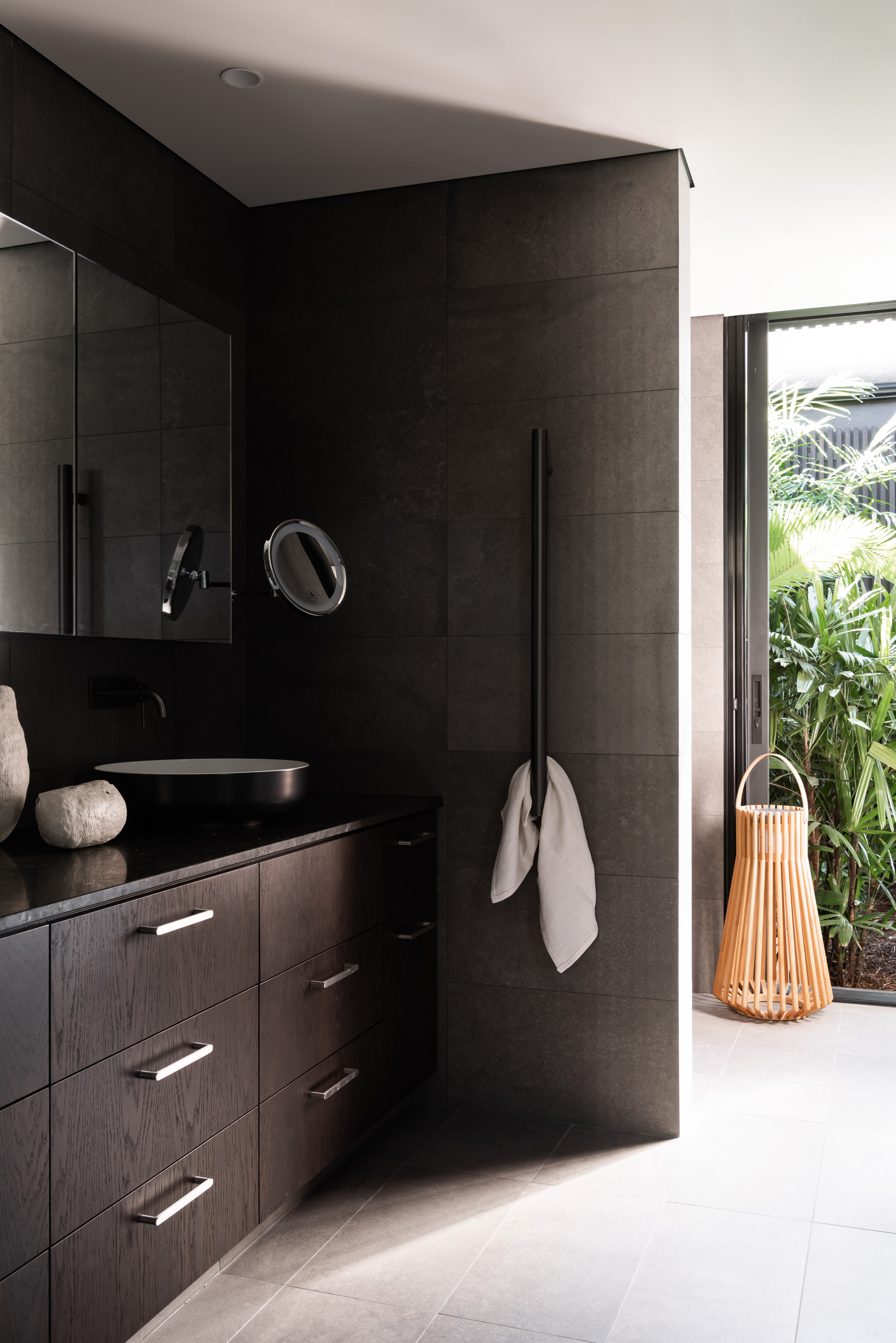 A series of Japanese-inspired, operable glazed walls and doors and retractable insect screens slide apart and into cavities at each courtyard, blurring the line between inside and out. Enhanced by Vulcan timber battens to the walls and ceiling, off-set by polished plaster, you feel as if you are walking along a bridge through a forest to the wetlands in the distance.
