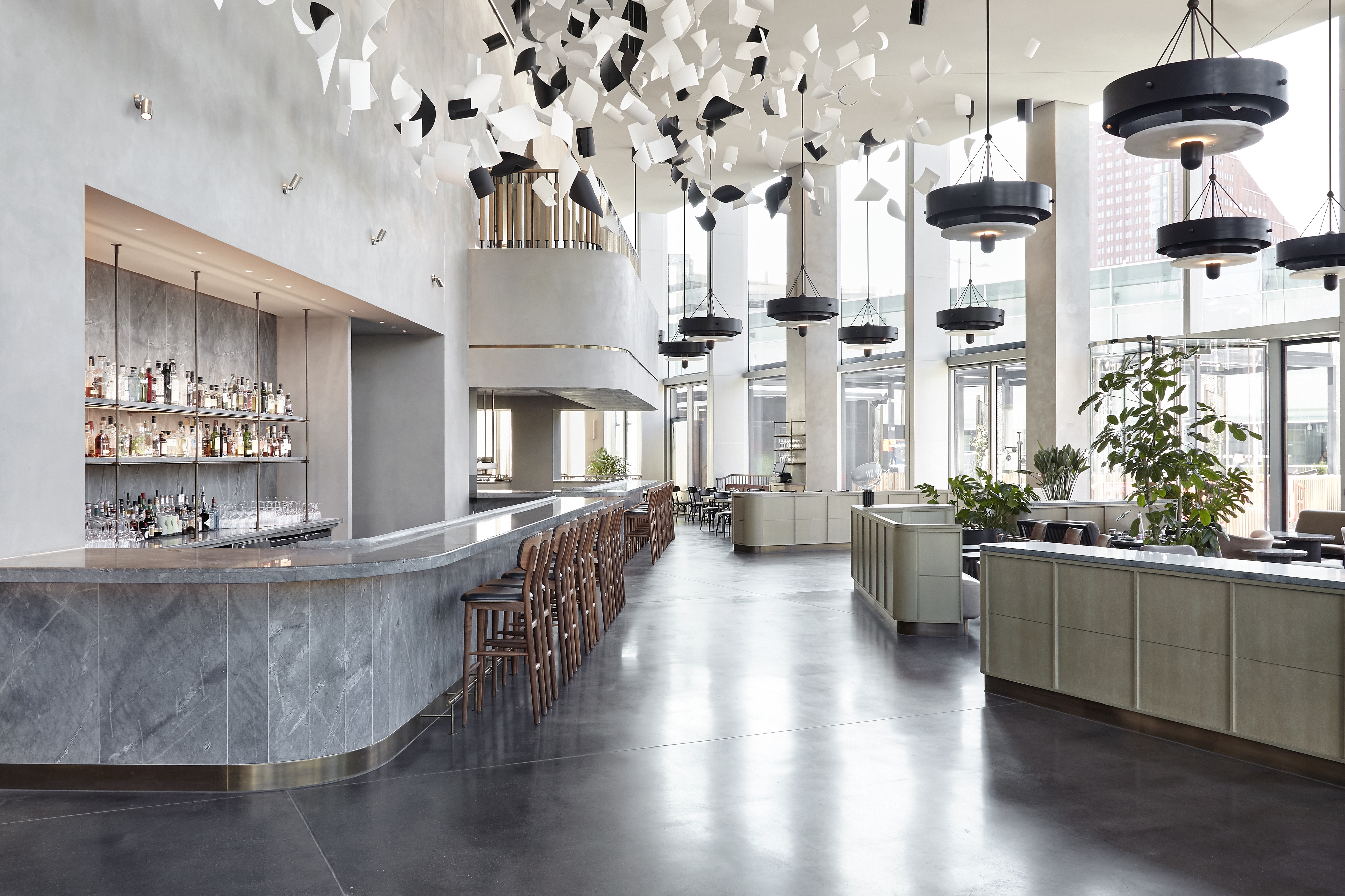 Space Copenhagen has created the interior design concept for the building’s lobby, hotel guestrooms, mezzanine, the ground floor Stratford Brasserie, as well as 7th floor restaurant, Allegra. The public areas each have distinctive design characteristics but overall seek to interweave, allowing visitors to move seamlessly between the spaces. Gently textured plastered walls, natural oak in earthy tones, warm metals and natural stones framed by a polished and dark pigmented concrete floor, serve to softly contrast the strong modern structure of the tower itself.