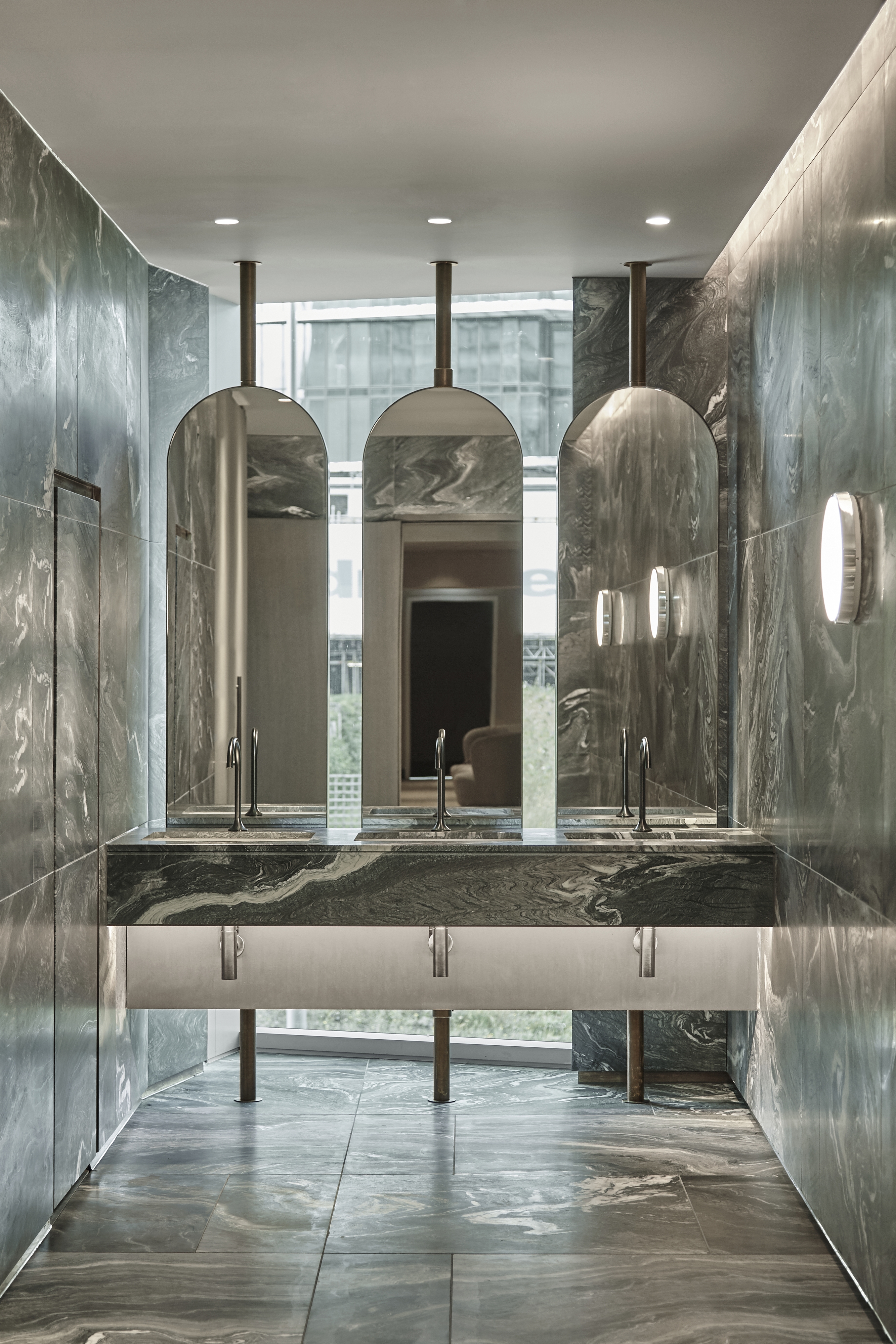 upholstered shapes complement each other. Stone-clad bathrooms with a serene ambience, heated floors, separate bathtubs and sculpted vanity mirrors offer supreme comfort. In all of the rooms Space Copenhagen has designed vanities and vanity mirrors, beds, bedside tables and desks exclusively for The Stratford. Besides their extensive bespoke work for the property, Space Copenhagen has included key furniture pieces from within their existing design portfolio in distinct upholstery and finishes for The Stratford from the likes of Gubi, Stellar Works and Benchmark.