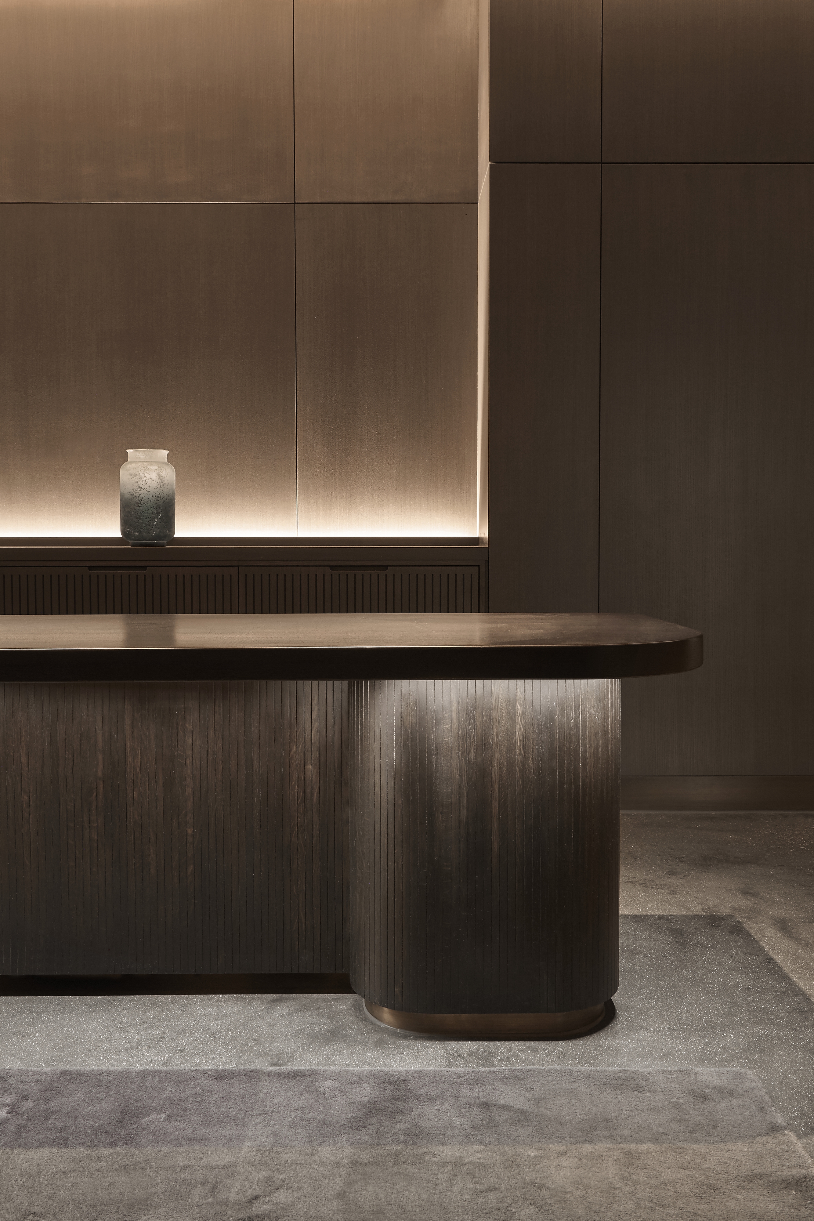 Upon entering the building, the architectural experience on the ground floor pivots around a large ninemetre high fireplace that anchors the triple height lobby, providing a sophisticated and dramatic community space. Guests are then drawn towards the hand-crafted reception desk, which is crafted in oak with darkened brass detailing and offset by sculptural lighting.