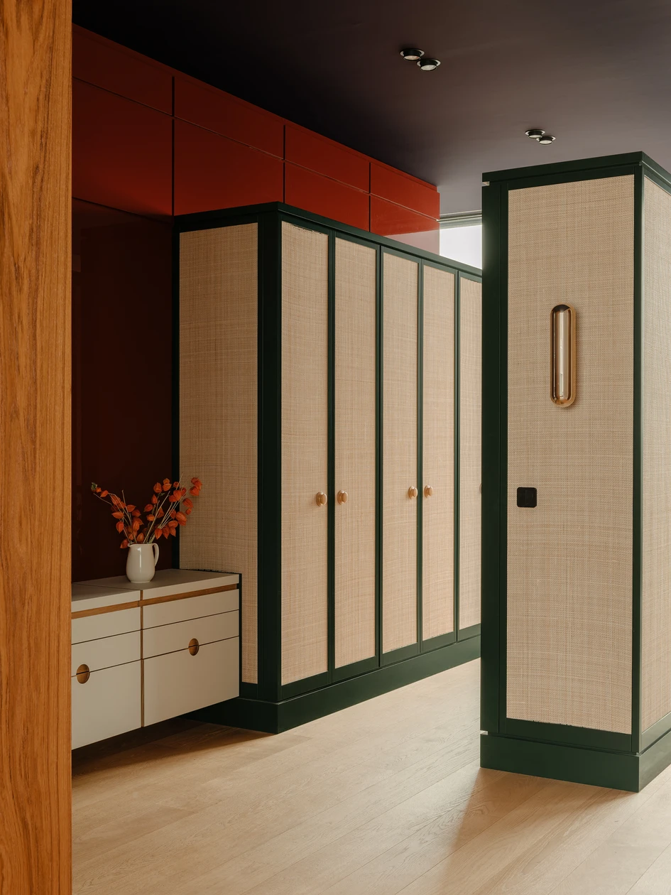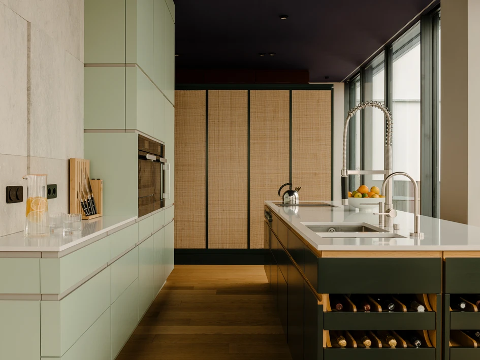We use them to create a ceiling frieze and skirting boards, which all the cabinet heights and doors are oriented around. At medium height we orientate ourselves to the countertop of the kitchen cube. Even the sandstone frieze adopts these lines. This grid helps to connect the many materials and guides the view through the apartment.