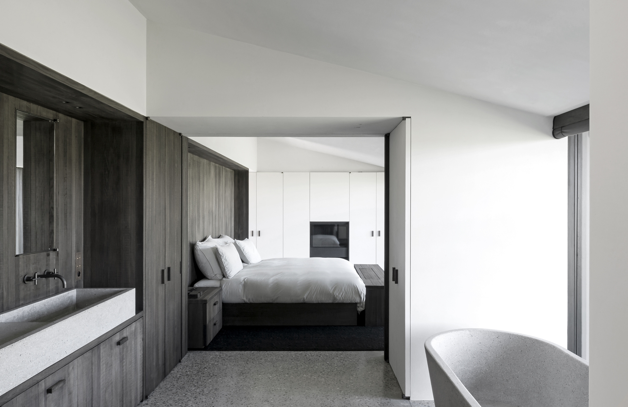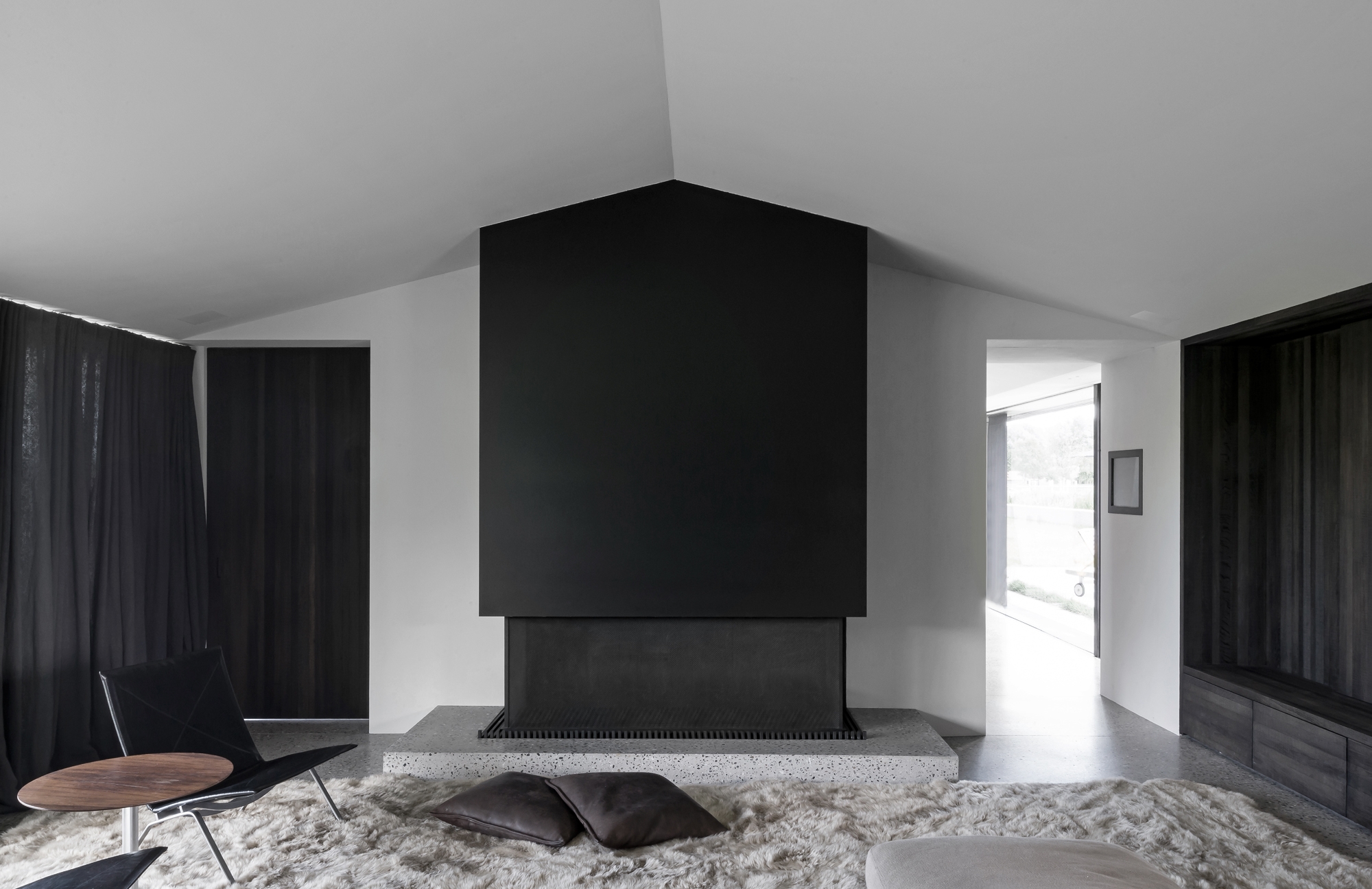The use of materials follows the barn typology but has been distilled. The storage rooms and stables of the farm are often covered in wooden planks both in Belgium and abroad. A natural and sustainable farmyard material that immediately references the rural character and forms the basis of the key construction material of the project. One has chosen, in a resolute way, to foresee all façade work, exterior cabinetry, and other visible parts in a black-stained wood, supported by a polished concrete base. This second sustainable material emphasizes again the utilitarian nature of the farm and is used a continuous floor surface both inside and out. Additional to this contemporary character, the black-stained wood contributes strongly to the sustainability and longevity of the built form. The palette of soft grey and anthracite is tempered by the surrounding in the green character of the trees, shrubs, and meadows. The green of the landscape also mingles with the exterior hard-scaped surfaces and defined planting that permeates the concrete strips in strategic places.