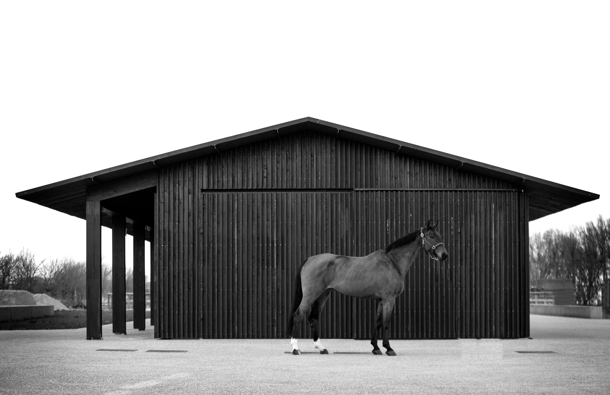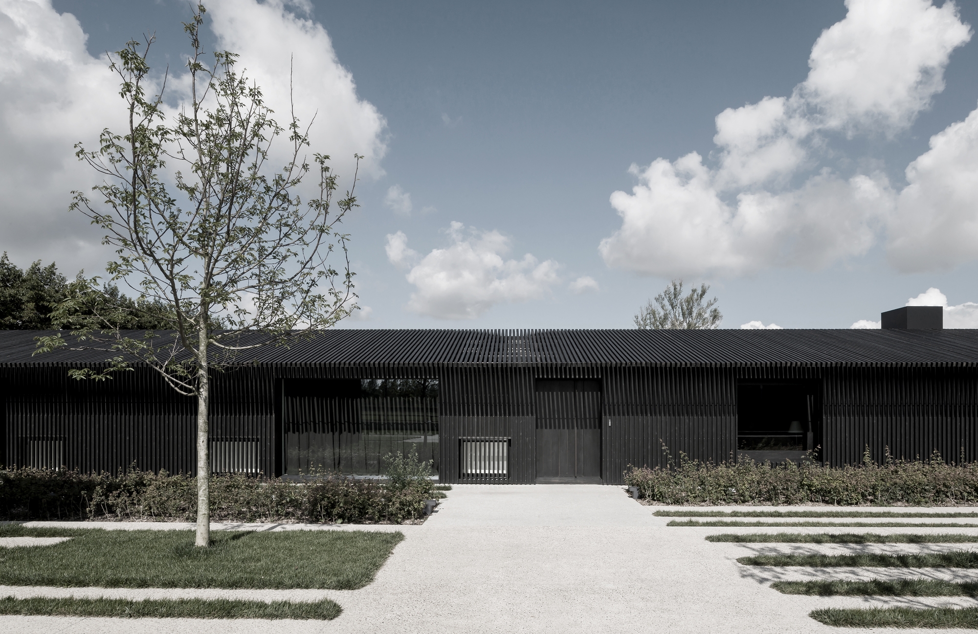 On reclaimed land close to the sea, with views delineated by an urban coastline, a limited volume of trees, shrubs, and a centrally sited farm buildings define the organization of the domain. The assignment was to replace existing structures with a contemporary farming business, stables, and surrounding orchard. The project has created a central place in the open landscape with an outspoken identity of the ‘yard’ with three elongated black-slatted wooden volumes forming the heart and life of the farm. The house, horse stables, and barn creating a clear boarder around the courtyard, which remains only partially enclosed, permitting a connectedness to the surrounding meadows. On a smaller scale, the open and flat character of the courtyard, on one hand, is broken by an elongated water feature – centered between the house and stables – and on the other its flat character is broken by a 60-meter retaining wall that catches the small undulation in the topography and terminates in an integrated cesspit.