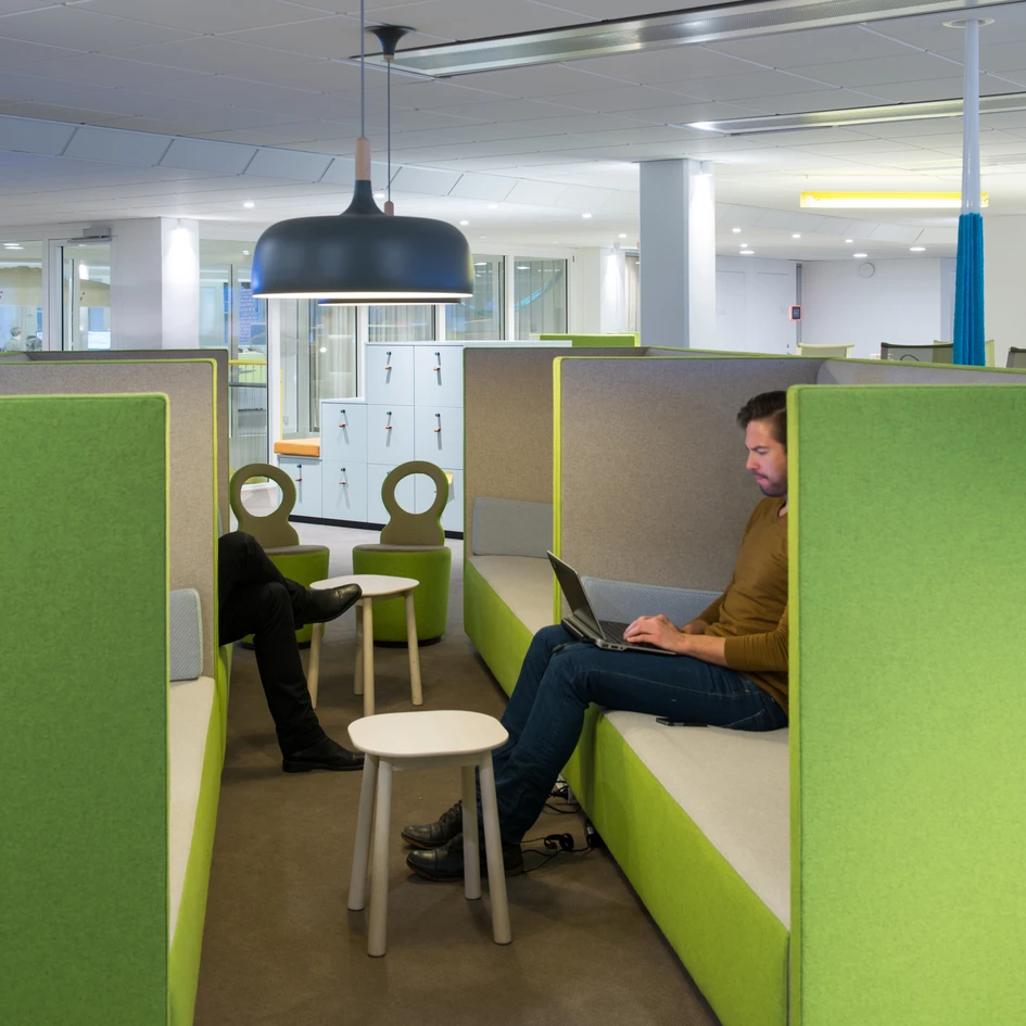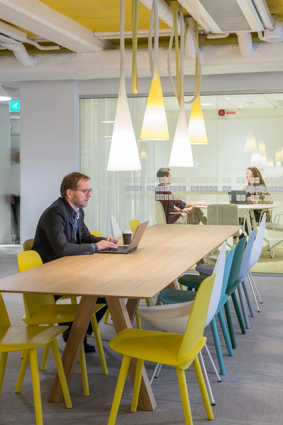 The brief was to create a working environment to support a modern way of working. No more large personal desks and fully booked meeting rooms – instead a choice of work places suited to fit the task at hand: either a smaller desk with double screens, or a hot desk, a quiet sofa group, the café etc.